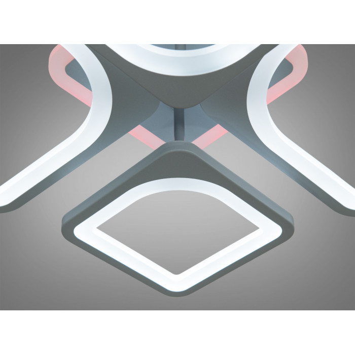 Стельова LED люстра 8060, 100 Вт, сіра — сучасний світильник з пультом, що поєднує яскраве основне освітлення та різнокольорову підсвітку RGB. Конструкція з чотирьох з’єднаних квадратів формує виразну геометрію та рівномірно розподіляє світло в кімнаті. Світильник монтується впритул до стелі, що зручно для приміщень із невисокими перекриттями.