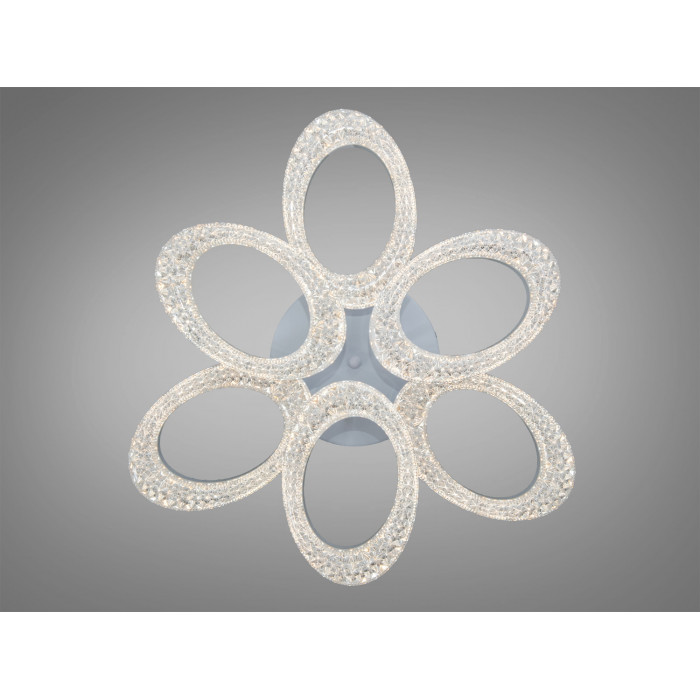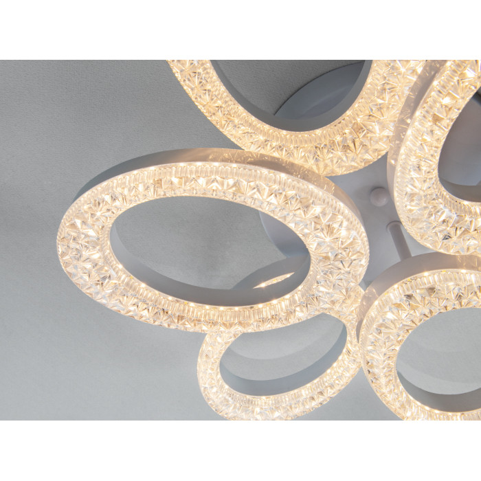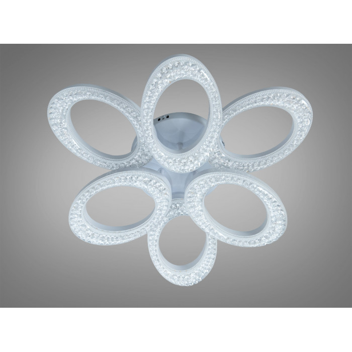 Шість овальних LED-кілець, розміщених у вигляді пелюсток, створюють об’ємний квітковий візерунок. Акуратні стики та гладке біле покриття візуально полегшують конструкцію. Такий підхід дозволяє світильнику не «тиснути» навіть у компактних кімнатах і водночас слугувати декоративним центром стелі.