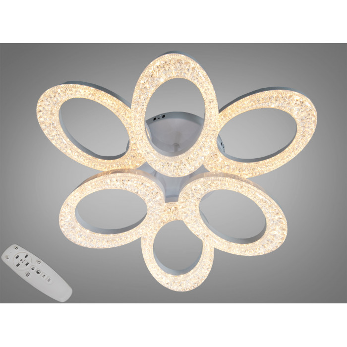 Стельова світлодіодна люстра із шістьма овальними кільцями у формі квітки створює рівномірне загальне освітлення та сучасний акцент у просторі. Білий корпус візуально зливається зі стелею, а м′яке розсіяне світло підкреслює фактуру інтер′єру без засліплення. Модель підтримує керування пультом і регулювання колірної температури від теплого до холодного білого, що дозволяє підібрати атмосферу для відпочинку, роботи чи вечірнього підсвічування. За рахунок потужності 60 Вт світильник розраховується орієнтовно на площу до 8–10 м² залежно від кольору стін та висоти стелі.
