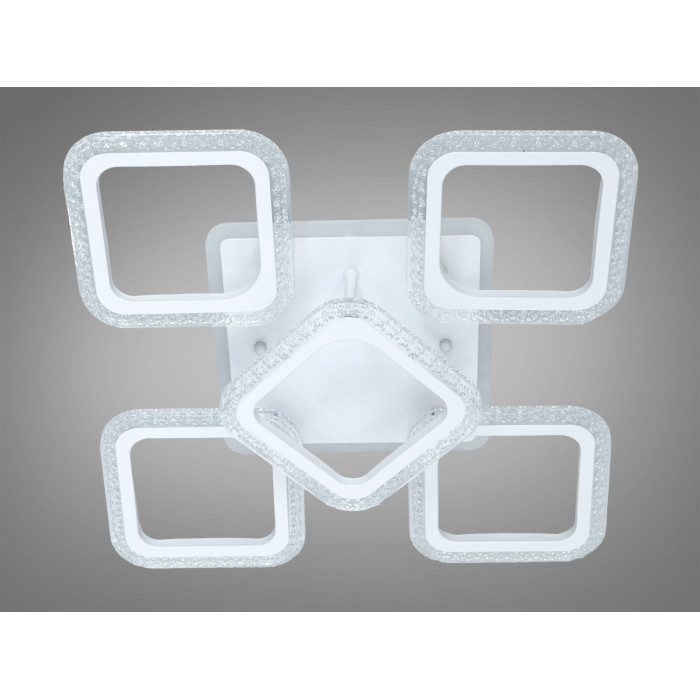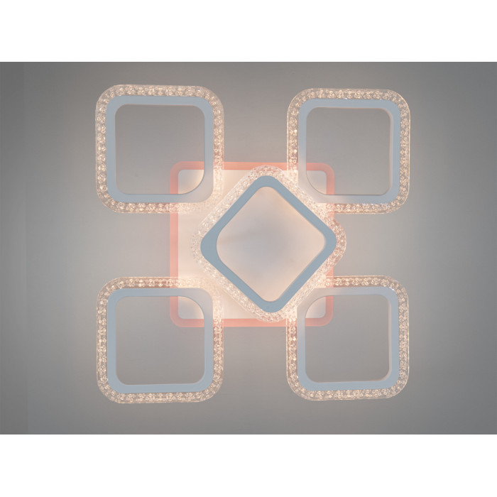 Ця стельова світлодіодна люстра у білому кольорі створює рівномірне базове освітлення та додає декоративну атмосферу завдяки триколірній підсвітці основи. Конструкція з п’яти світлових модулів (чотири квадратні рамки з кристалічними вставками та центральний елемент) формує м’яке сяйво без різких тіней. Потужність 70 W зазвичай вистачає для освітлення до 12 м² — наприклад, спальні, дитячої або невеликої вітальні з низькими стелями.