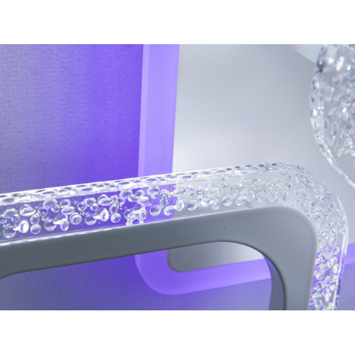 - Триколірна підсвітка основи: декоративне підсвічування змінює настрій простору. За знімками моделі підсвітка може відтіняти простір синім чи теплим рожевим кольором, а також білим сяйвом.