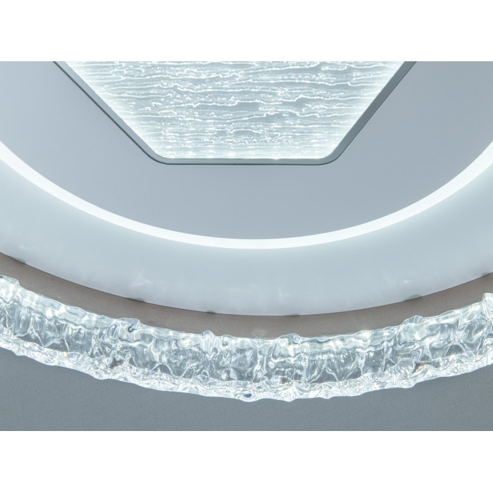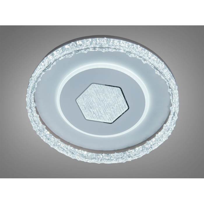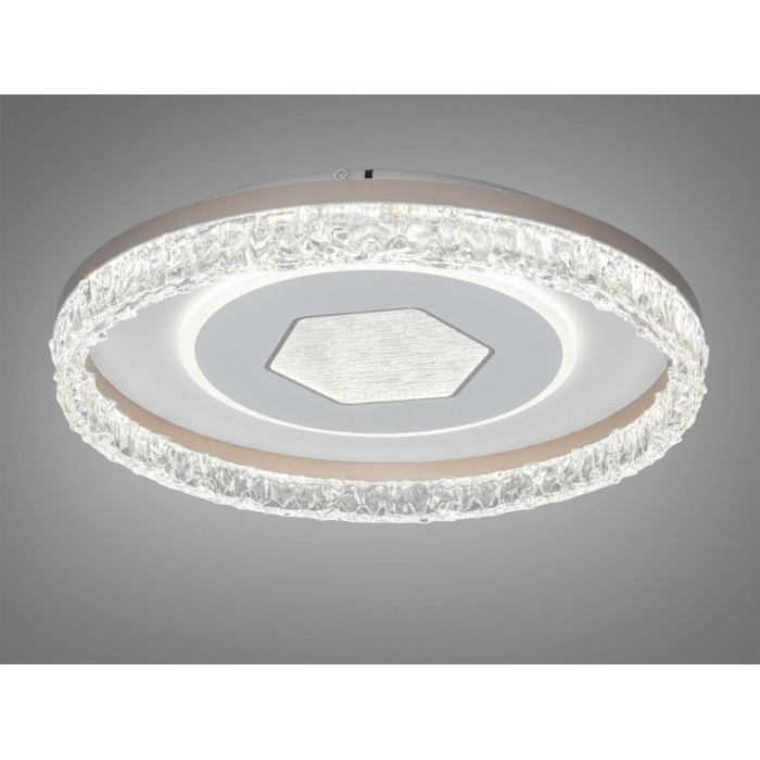 Форма корпусу — кругла, з прозорим фактурним обідком, що додає глибини світловому малюнку. У центрі — геометричний шестикутний елемент, який створює сучасний акцент та візуально структурує плафон. Нейтральний білий колір дозволяє світильнику поєднуватися з більшістю оздоблювальних матеріалів і палітр. Закритий розсіювач приховує джерела світла, зменшує сліпіння та забезпечує рівномірне заповнення простору світлом.