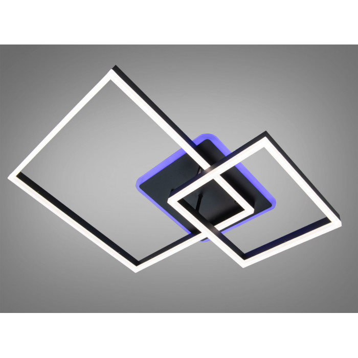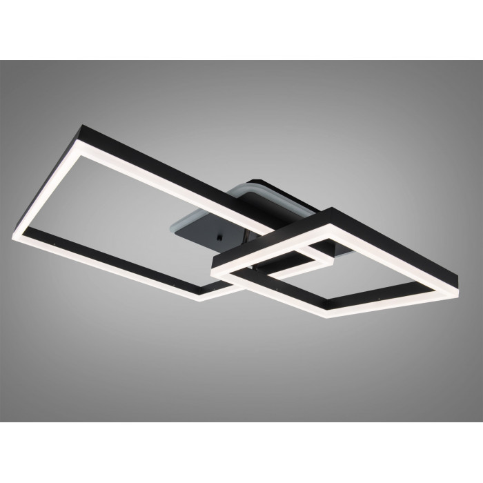 Поєднання двох квадратних контурів формує чисту архітектурну лінію та візуально структурує кімнату. Чорне матове покриття допомагає уникнути відблисків і слідів, а світлодіодні елементи дають рівномірний потік через розсіювач. У подібних моделях зазвичай використовують металевий каркас і полімерний (акриловий) розсіювач — така конфігурація сприяє стабільності конструкції та м’якому світлу без засліплення.