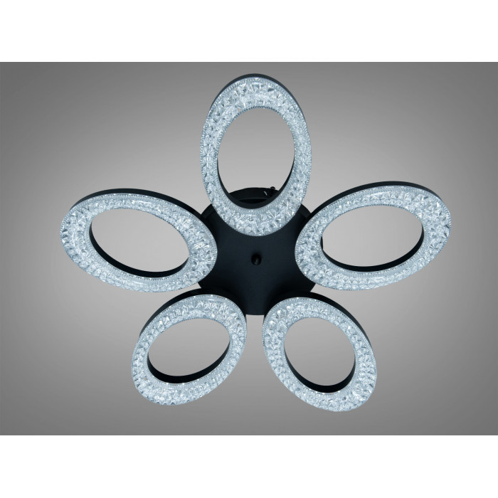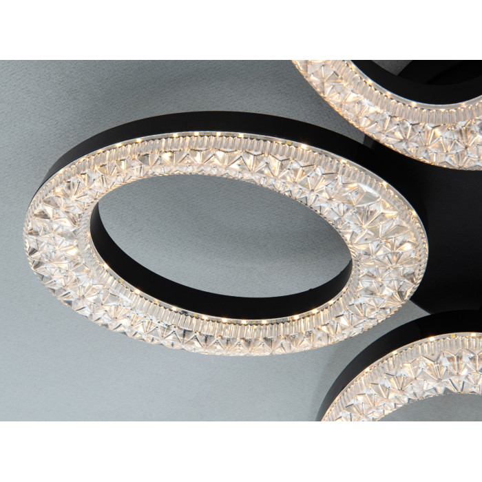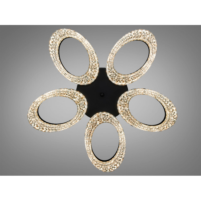 Декоративна композиція з кілець формує «квітку», а прозорі вставки-кристали підсилюють іскристі відблиски без різких тіней. Накладний монтаж з невеликою висотою корпусу зручний для приміщень з невисокими стелями. Акрилові розсіювачі забезпечують рівномірне розсіювання світла, а чорне покриття корпусу підкреслює графічні лінії світильника.
