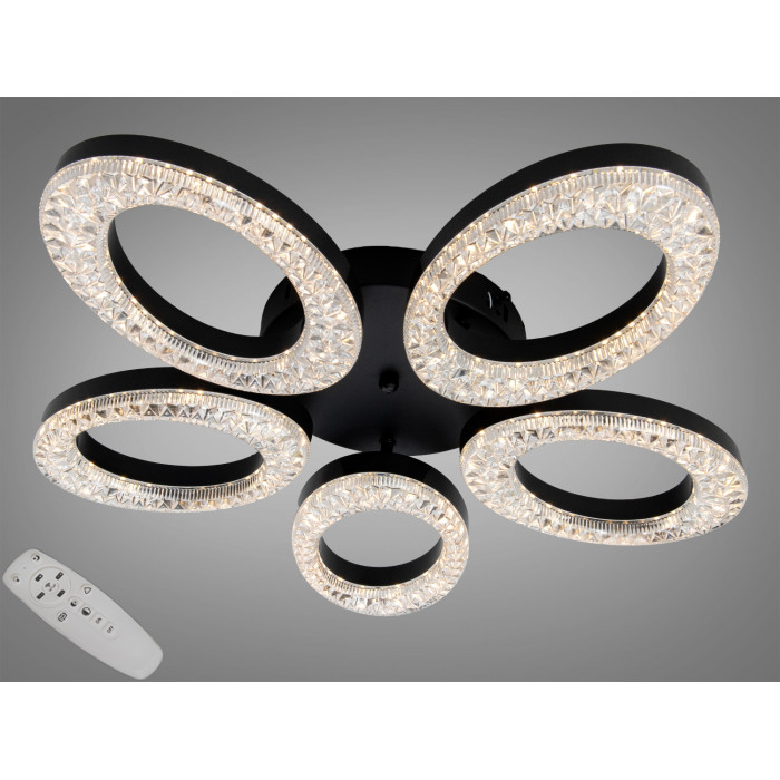 Стельова світлодіодна люстра Diasha у чорному кольорі — варіант для кімнат до приблизно 9 м², де важливі комфортне керування та сучасна геометрія. Конструкція поєднує п’ять світлових модулів у формі кілець або овалів, прикрашених кристалами. Вбудовані світлодіоди працюють з пультом дистанційного керування, що дозволяє змінювати колірну температуру та регулювати яскравість відповідно до завдань і часу доби.