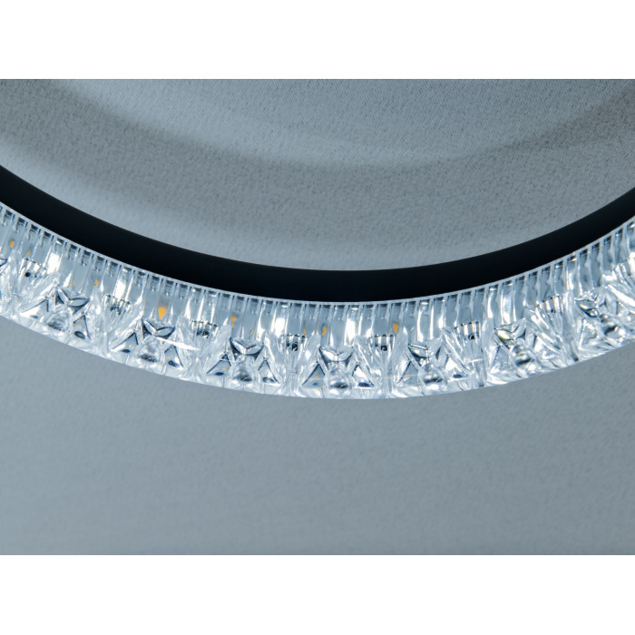 Якщо у приміщенні потрібен виразний сучасний акцент і розподілене світло на площу до 25 м², ця стельова LED люстра з шістьма кільцями може стати вдалим рішенням. Чорний колір підкреслює геометрію композиції, а акрил та кристалічні деталі додають ефекту глибини під час освітлення.