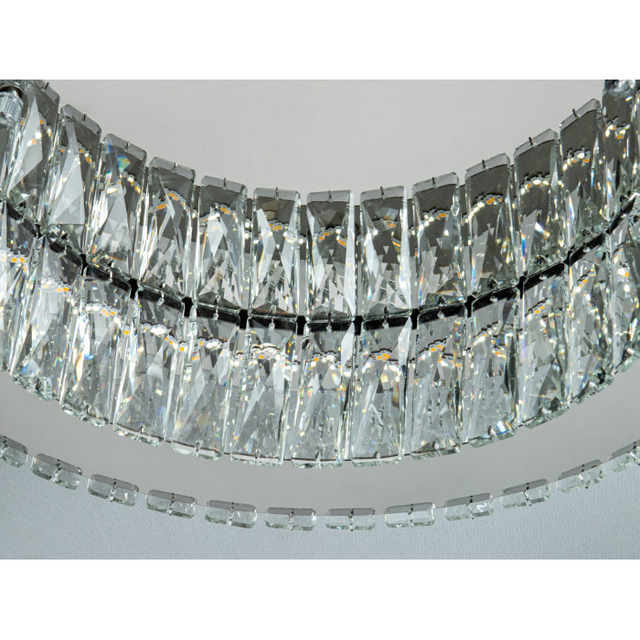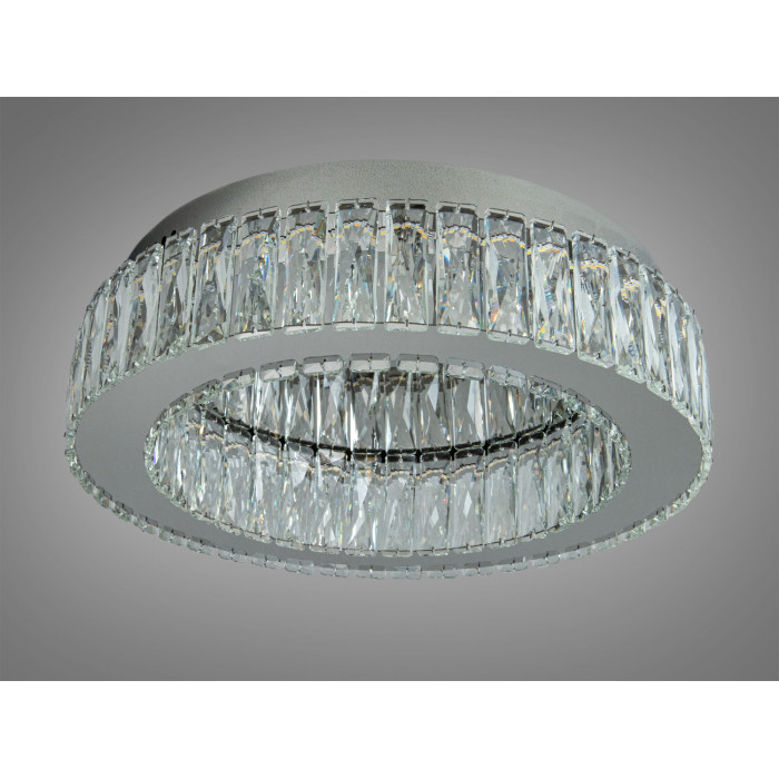 Ця стельова кришталева люстра поєднує сучасну LED-технологію та лаконічний дизайн. Вона створена для невеликих приміщень і зазвичай забезпечує комфортне основне освітлення для площі близько до 8 м². Хромоване покриття підкреслює геометрію корпусу, а кришталеві елементи формують виразні відблиски без зайвої яскравості. Комплектується пультом дистанційного керування для зручного налаштування світла.