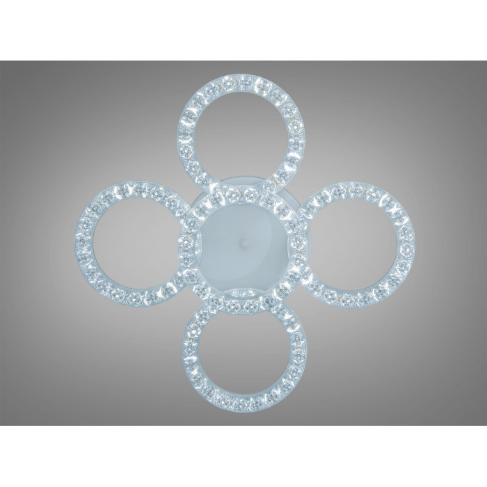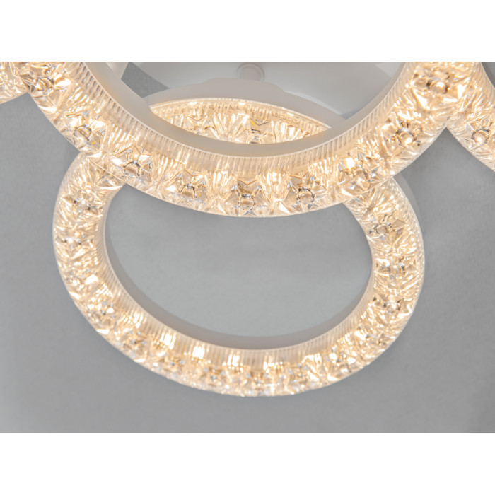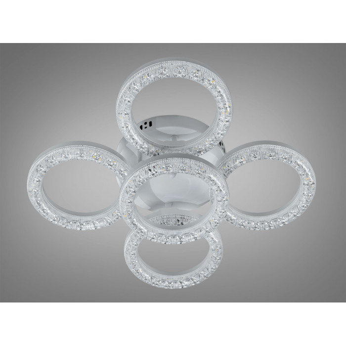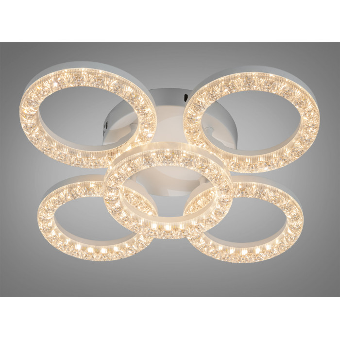 Композиція з п’яти кілець різного діаметра створює багаторівневу світлову площину без різких «гарячих точок». Біла металева основа візуально полегшує конструкцію, добре читається на світлих стелях і не перевантажує інтер’єр. Прозорі акрилові розсіювачі дають м’який дифузний потік з легким іскристим ефектом, що підкреслює текстуру стелі без використання крихких скляних елементів.