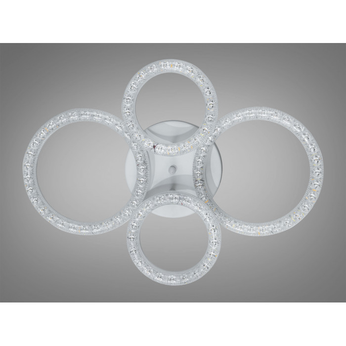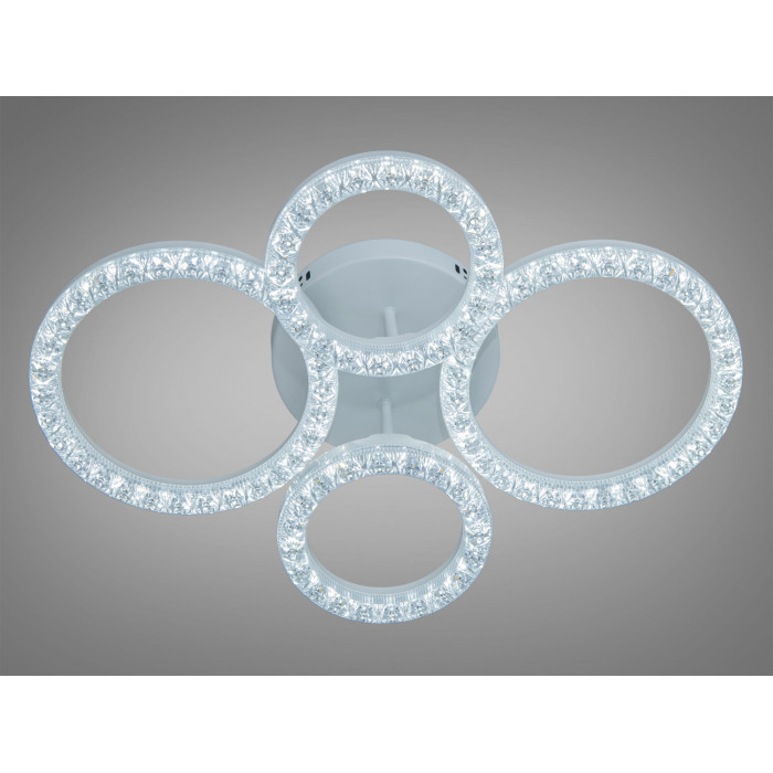 Композиція з чотирьох кілець формує впізнаваний силует категорій люстри кільця і світлодіодні люстри. Низький профіль виглядає акуратно на стандартних і невисоких стелях, зберігаючи відчуття відкритого простору. Білий матовий корпус зливається з більшістю світлих стель, а акрил із «кристалічним» ефектом надає світлу глибини, зменшуючи блиск і різкі тіні.