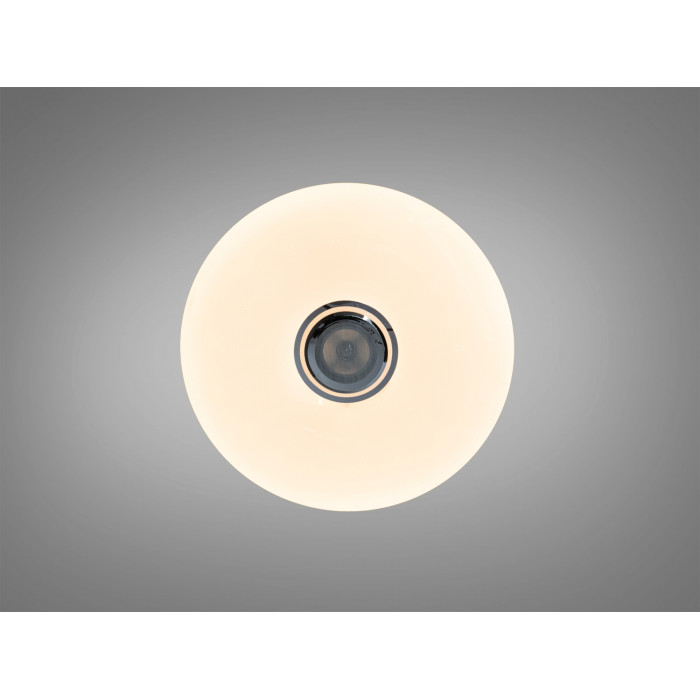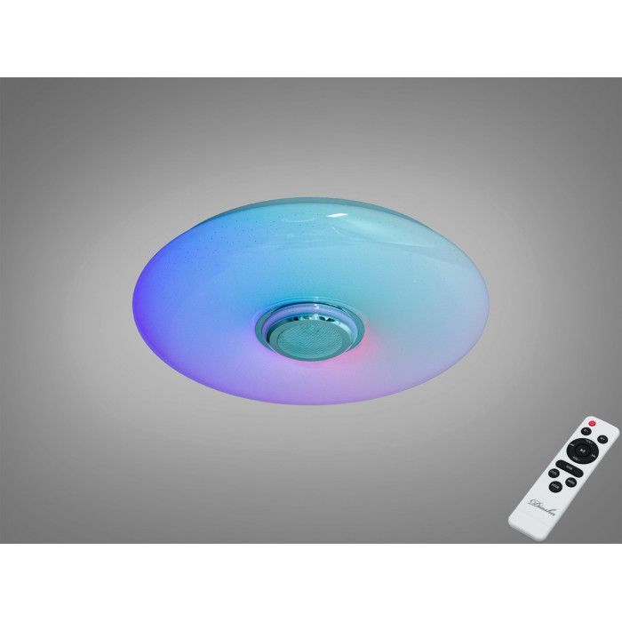 Ця LED стельова люстра білого кольору з RGB поєднує освітлення та відтворення музики у одному корпусі. Вбудована Bluetooth-колонка дає змогу слухати треки зі смартфона, а керування освітленням реалізоване через додаток Smart Life (платформа TUYA) або пульт ДК. Потужність 80 Вт передбачає комфортне загальне освітлення приміщення до приблизно 14 м² з можливістю точно підлаштувати яскравість і температуру білого світла.