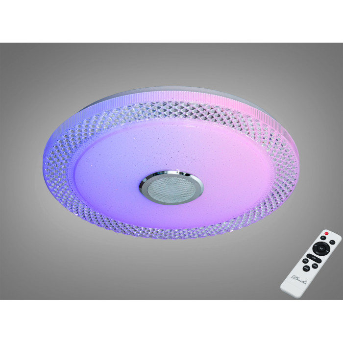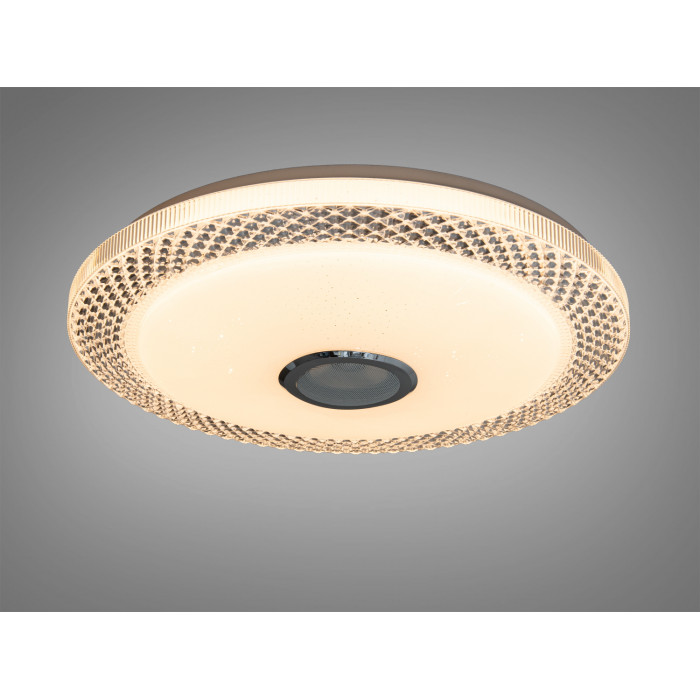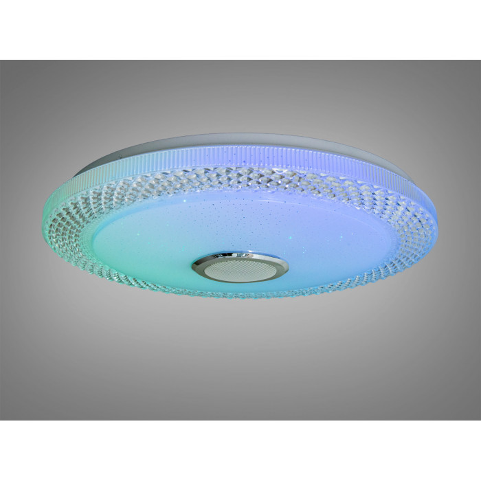 Ця LED стельова люстра білого кольору з RGB поєднує освітлення та відтворення музики у одному корпусі. Вбудована Bluetooth-колонка дає змогу слухати треки зі смартфона, а керування освітленням реалізоване через додаток Smart Life (платформа TUYA) або пульт ДК. Потужність 80 Вт передбачає комфортне загальне освітлення приміщення до приблизно 14 м² з можливістю точно підлаштувати яскравість і температуру білого світла.