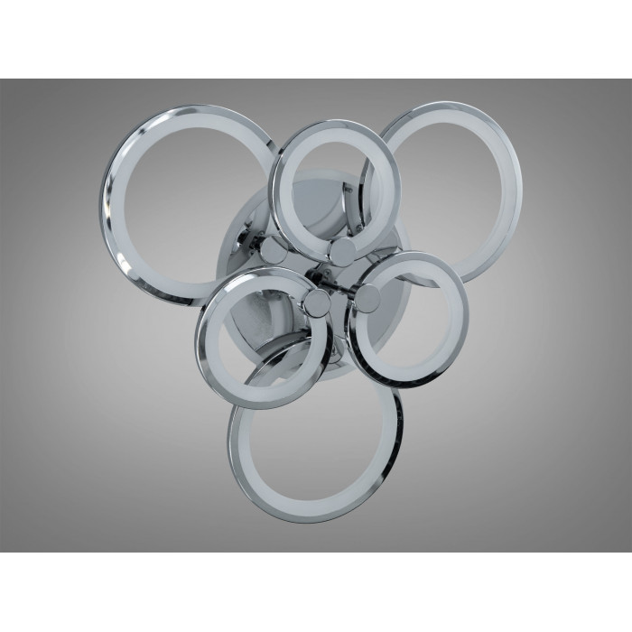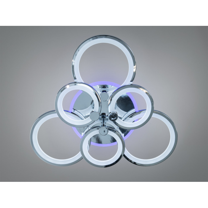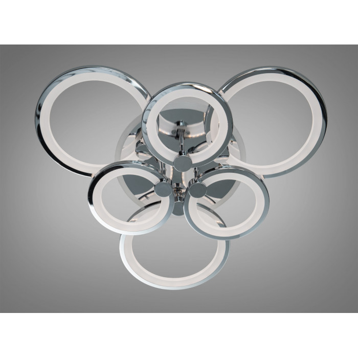 Світлодіодна люстра під стелю виконана у формі композиції з шести круглих елементів різного діаметра, які, немов орбіти, переплітаються між собою. Хромована основа контрастує з розсіювачами й робить її універсальним рішенням для інтер′єрів у стилі хай-тек, мінімалізм або лофт. Акрилові розсіювачі забезпечують м′яке, рівномірне розсіювання світла, не створюючи тіней чи блиску. Завдяки поєднанню чорного кольору корпусу та розсіювачів, які змінюють свій відтінок залежно від режиму освітлення, люстра створює ефект стильного контрасту.