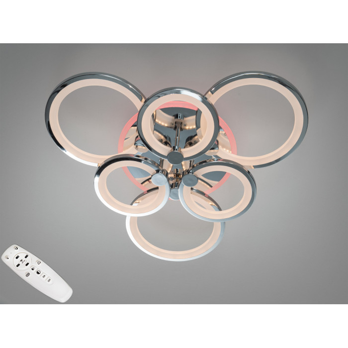 Стельова LED люстра з пультом, диммером та підсвічуванням, 110W — це витончене поєднання сучасних технологій, естетики та функціональності, що здатне стати центральним елементом вашого інтер′єру. Її дизайн відразу привертає увагу своїми геометрично досконалими кільцями, які гармонійно поєднують хромований колір основи з елегантним світінням акрилових розсіювачів. Ця акрилова люстра неначе оживає в просторі, створюючи враження, що світло плавно витікає з її серцевини, огортаючи кімнату теплом і затишком.