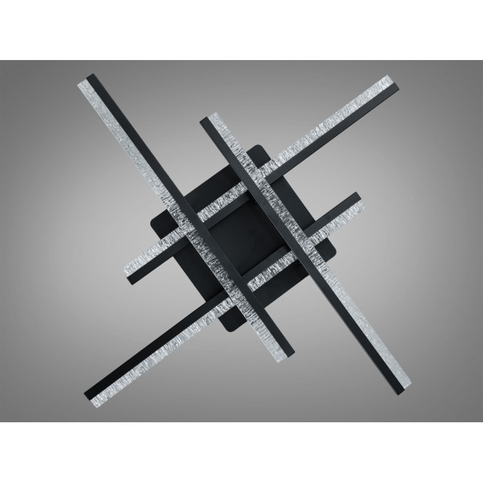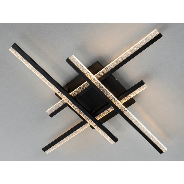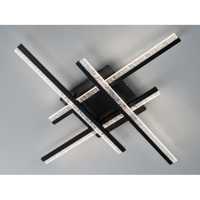 Композиція з кількох перехресних «променів» у чорному кольорі поєднується з напівпрозорими акриловими вставками. Такий підхід додає світильнику глибини: частина світла спрямовується вниз, а частина — м′яко розсіюється, зменшуючи контраст тіней. Матова поверхня планок візуально «літає» під стелею та не перевантажує простір.