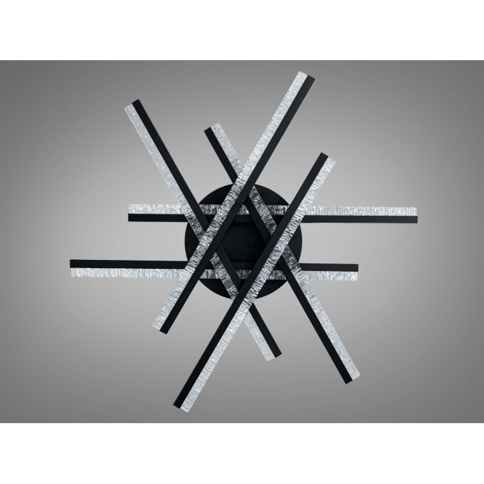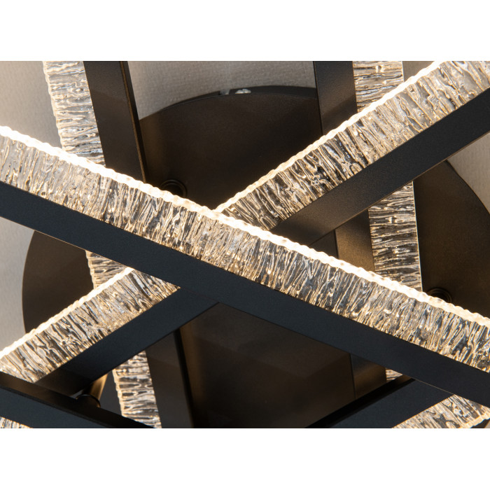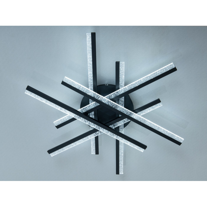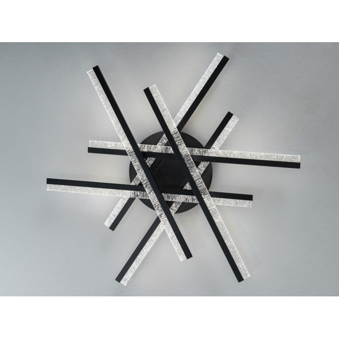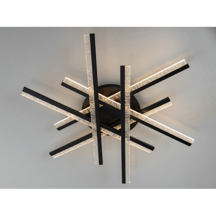 Композиція з перехресних ліній нагадує зірку: чорні промені з прозорими краями утворюють графічний силует, який добре читається на білих і сірих стелях. Акрил із текстурованими вкрапленнями створює м’який світловий ефект без різких відблисків і допомагає рівно розподілити потік. Накладний монтаж забезпечує акуратний вигляд і економить висоту приміщення, що зручно для квартир зі стандартними стелями.