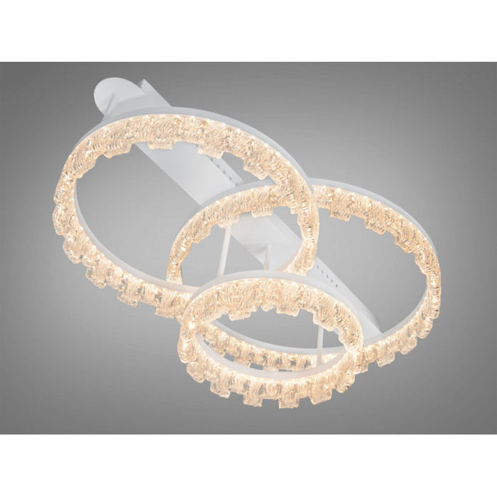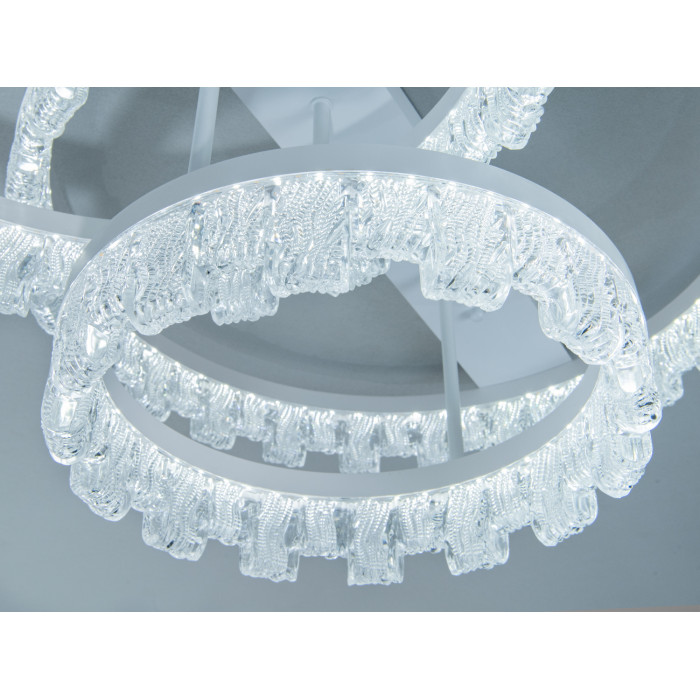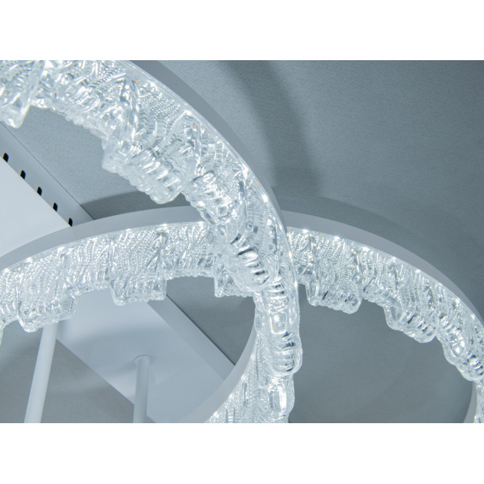 MX7805-500+400+300WH — це стельова світлодіодна люстра потужністю 75 Вт з білою основою та трьома прозорими акриловими кільцями. Текстурований акрил із декоративними бульбашками формує м’які відблиски й безпечну для очей світлову пляму. Конструкція монтується впритул до стелі, економить простір і візуально «полегшує» кімнату, що особливо доречно у сучасних мінімалістичних інтер’єрах.