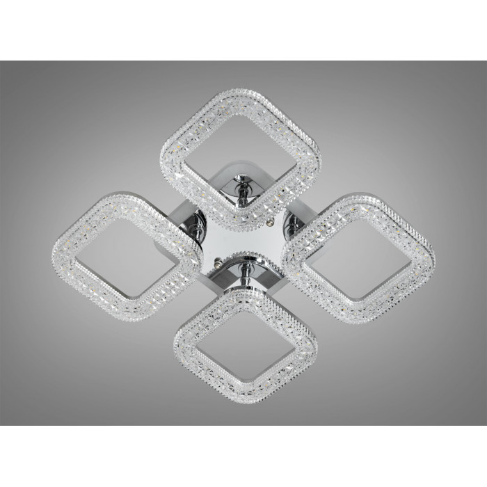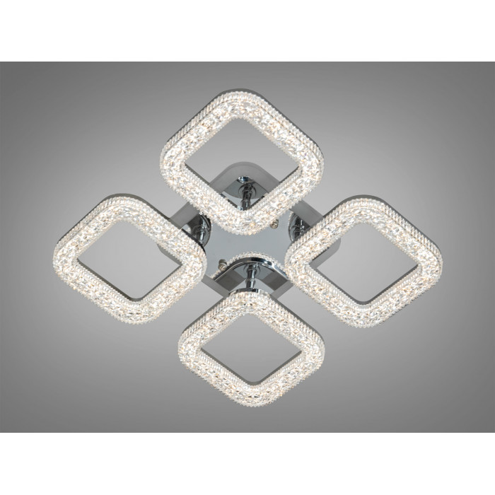 Стельова світлодіодна люстра з пультом в кольорі хрому від ТМ "Діаша" — це поєднання елегантного дизайну, функціональності та сучасних технологій. Її конструкція включає чотири витончені квадратні елементи, кожен із яких виконаний із міцного металу з хромованим покриттям та обрамлений рифленим акриловим розсіювачем. Така текстурна поверхня акрилу надає люстрі додаткового об’єму, а також забезпечує рівномірний і м’який розподіл світла по всій кімнаті. Завдяки цьому освітлення створює затишну атмосферу, яка сприяє комфорту і гармонії в інтер’єрі.