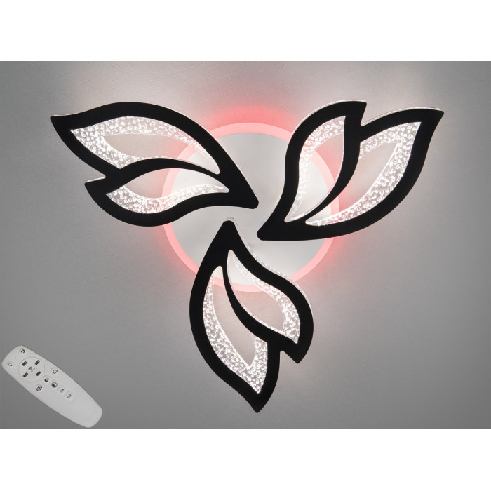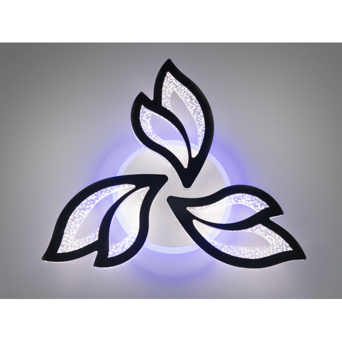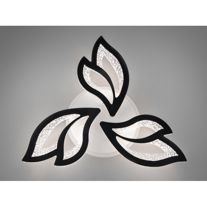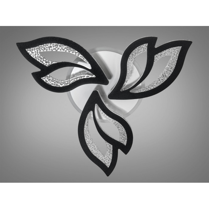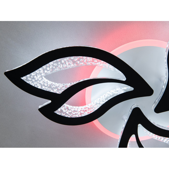 Лед люстра складається з трьох окремих елементів у формі листків або пелюсток, які граційно розташовані навколо центральної частини. Кожен з цих елементів виготовлений з прозорого акрилу з декоративними включеннями, що нагадують бульбашки, створюючи оригінальний візерунок, який приваблює погляд і додає люстрі легкості. Коли світло включене, воно просвічує через ці елементи, створюючи на стелі красивий малюнок з відблисків і тіней, що додає особливого шарму атмосфері приміщення.