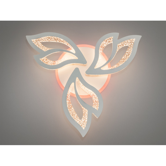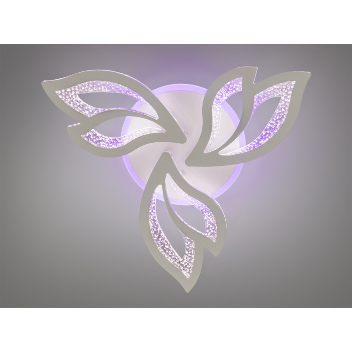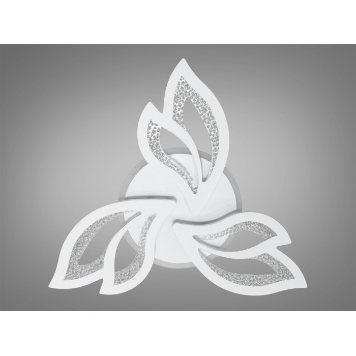 Лед люстра складається з трьох окремих елементів у формі листків або пелюсток, які граційно розташовані навколо центральної частини. Кожен з цих елементів виготовлений з прозорого акрилу з декоративними включеннями, що нагадують бульбашки, створюючи оригінальний візерунок, який приваблює погляд і додає люстрі легкості. Коли світло включене, воно просвічує через ці елементи, створюючи на стелі красивий малюнок з відблисків і тіней, що додає особливого шарму атмосфері приміщення.