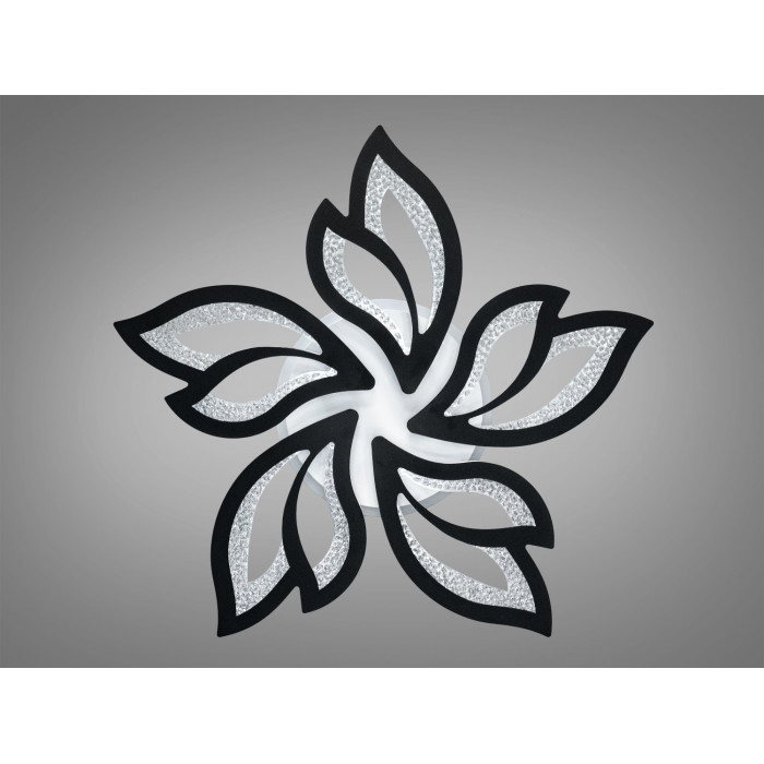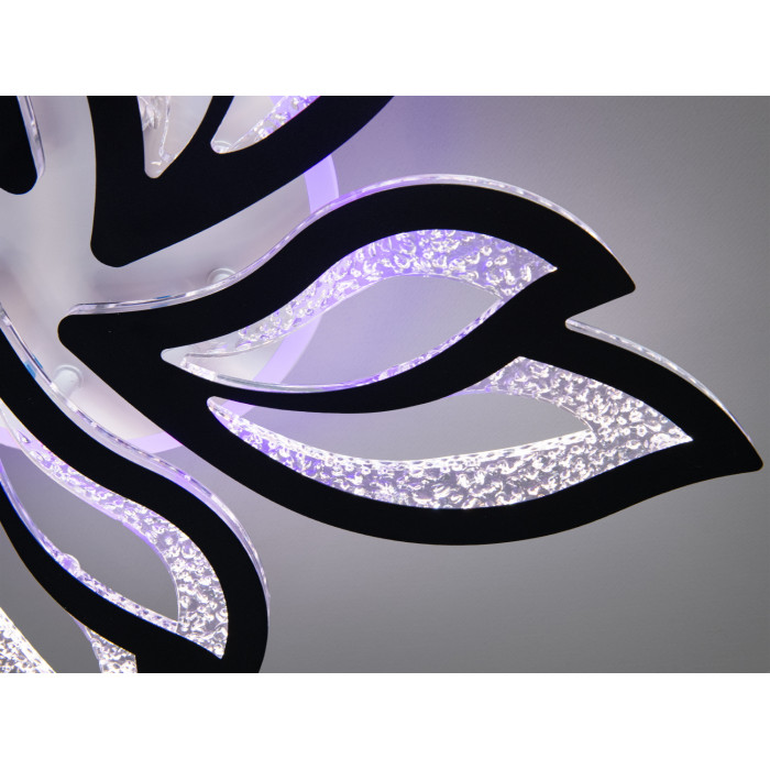 Ця люстра має форму п’яти витончених пелюсток, які розташовані симетрично навколо центру. Їх білий корпус гармонійно поєднується з акриловими вставками, що заповнені візерунками, які нагадують мерехтливі краплі роси на ранковій квітці. Під час роботи підсвітки ці вставки створюють ніжне сяйво, додаючи інтер’єру казкової чарівності. Усі елементи акрилової люстри зібрані на білосніжній металевій основі, що додає їй легкості та сучасного вигляду.