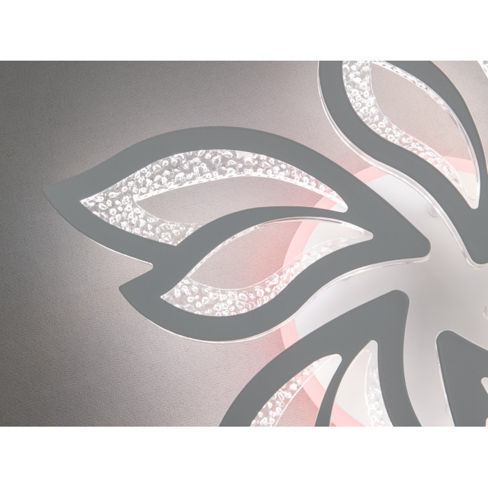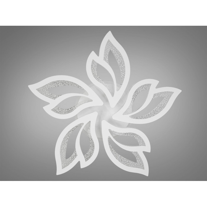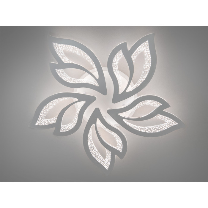 Ця люстра має форму п’яти витончених пелюсток, які розташовані симетрично навколо центру. Їх білий корпус гармонійно поєднується з акриловими вставками, що заповнені візерунками, які нагадують мерехтливі краплі роси на ранковій квітці. Під час роботи підсвітки ці вставки створюють ніжне сяйво, додаючи інтер’єру казкової чарівності. Усі елементи акрилової люстри зібрані на білосніжній металевій основі, що додає їй легкості та сучасного вигляду.