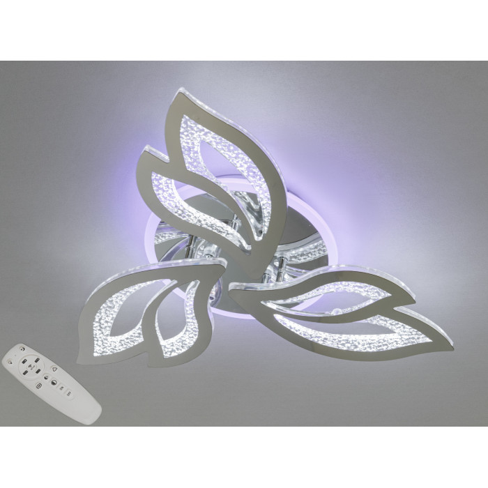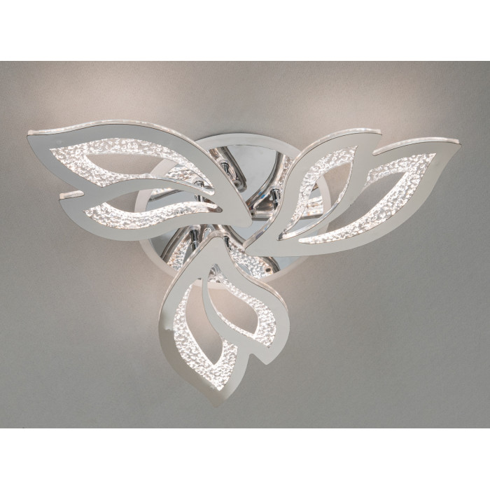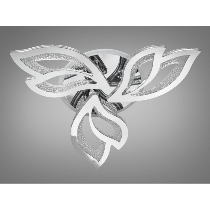 Хромована лед люстра складається з трьох окремих елементів у формі пелюсток, які граційно розташовані навколо центральної частини. Кожен з цих елементів виготовлений з прозорого акрилу з декоративними включеннями, що нагадують бульбашки, створюючи оригінальний візерунок, який приваблює погляд і додає лед люстрі легкості. Коли світло включене, воно просвічує через ці елементи, створюючи на стелі красивий малюнок з відблисків і тіней, що додає особливого шарму атмосфері приміщення.
