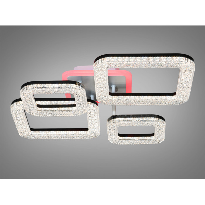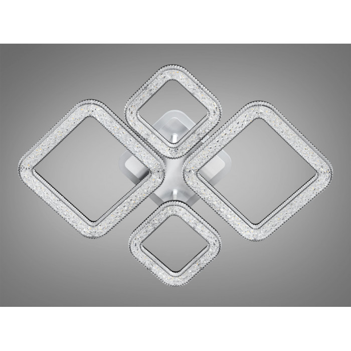 Стельова світлодіодна люстра з пультом від ТМ «Діаша» відразу привертає увагу своєю нестандартною конструкцією і сучасним дизайном. Виготовлена з акрилу з візерунковим рифленням, люстра лед складається з чотирьох квадратних плафонів, кожен з яких являє собою візуально витончену квадратну рамку. Унікальність дизайну полягає у розташуванні цих рамок-плафонів, які розташовані на різних рівнях і створюють візуальний ефект тривимірної геометричної композиції, що створює враження легкості та динамізму в просторі.