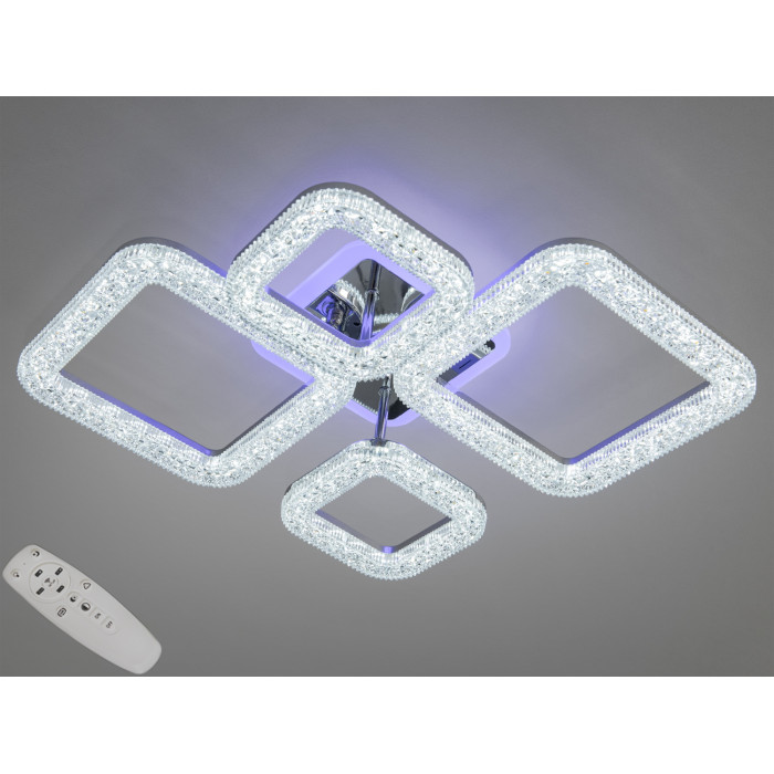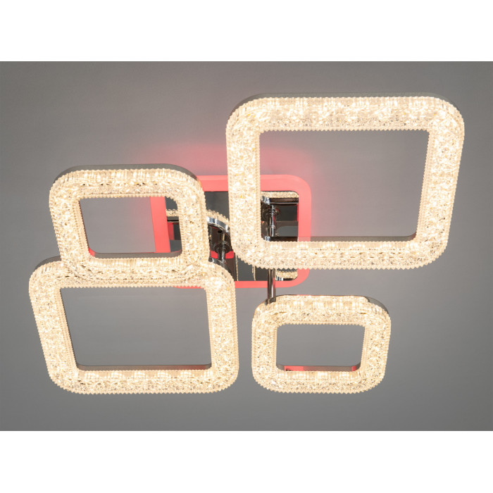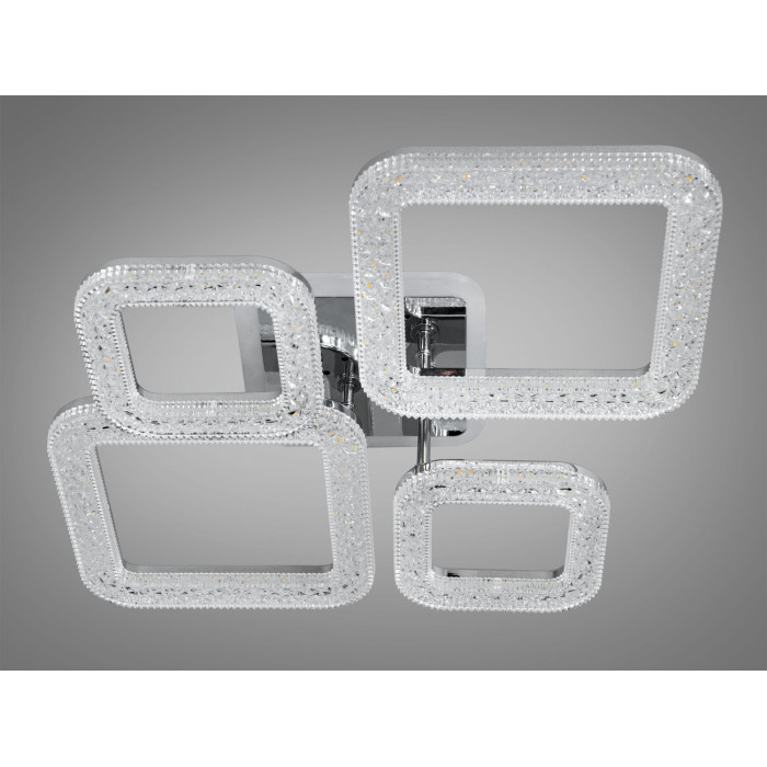 Стельова світлодіодна люстра з пультом від ТМ «Діаша» відразу привертає увагу своєю нестандартною конструкцією і сучасним дизайном. Виготовлена з акрилу з візерунковим рифленням, люстра лед складається з чотирьох квадратних плафонів, кожен з яких являє собою візуально витончену квадратну рамку. Унікальність дизайну полягає у розташуванні цих рамок-плафонів, які розташовані на різних рівнях і створюють візуальний ефект тривимірної геометричної композиції, що створює враження легкості та динамізму в просторі.