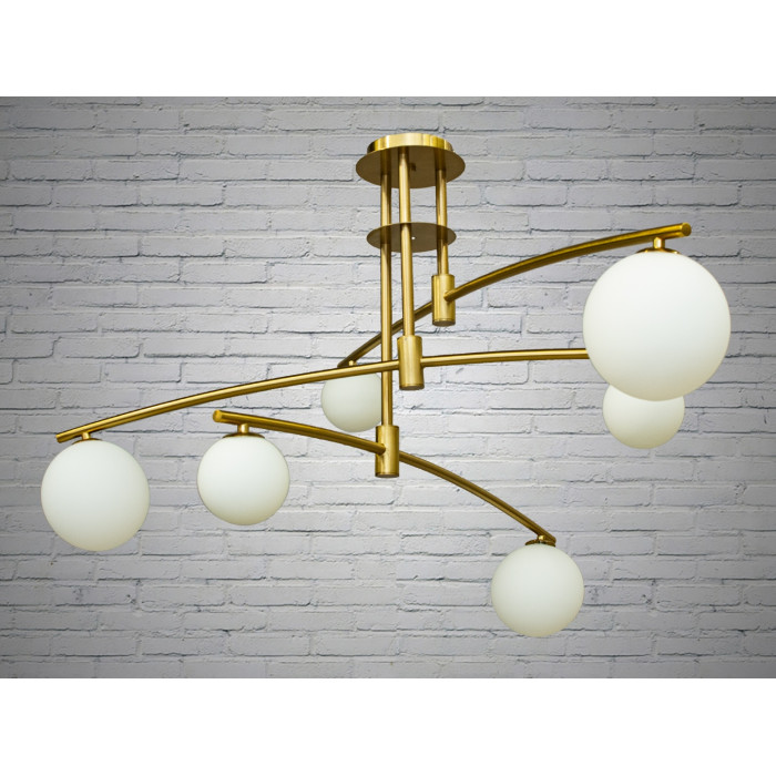 Зовнішній вигляд цієї люстри привертає увагу з першого погляду. Шість білих матових скляних плафонів розташовані на різних рівнях, створюючи цікаву асиметрію, яка надає конструкції динамічності. Золотисті металеві елементи підкреслюють її сучасний стиль, роблячи її ідеальною для будь-якого приміщення.