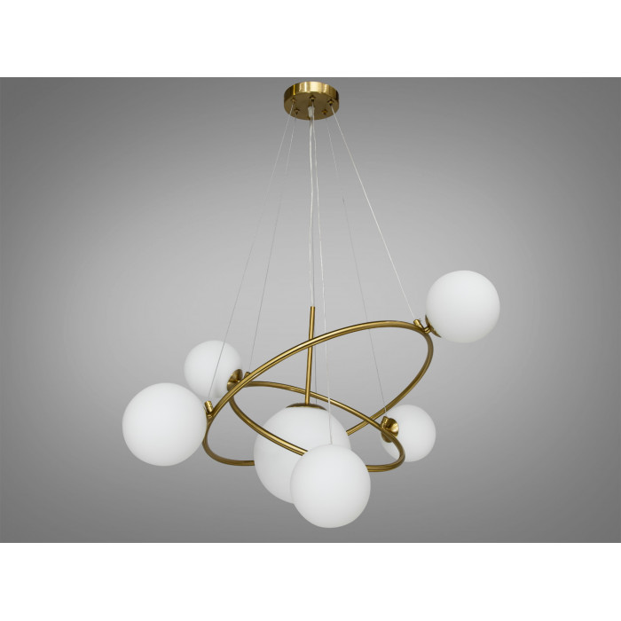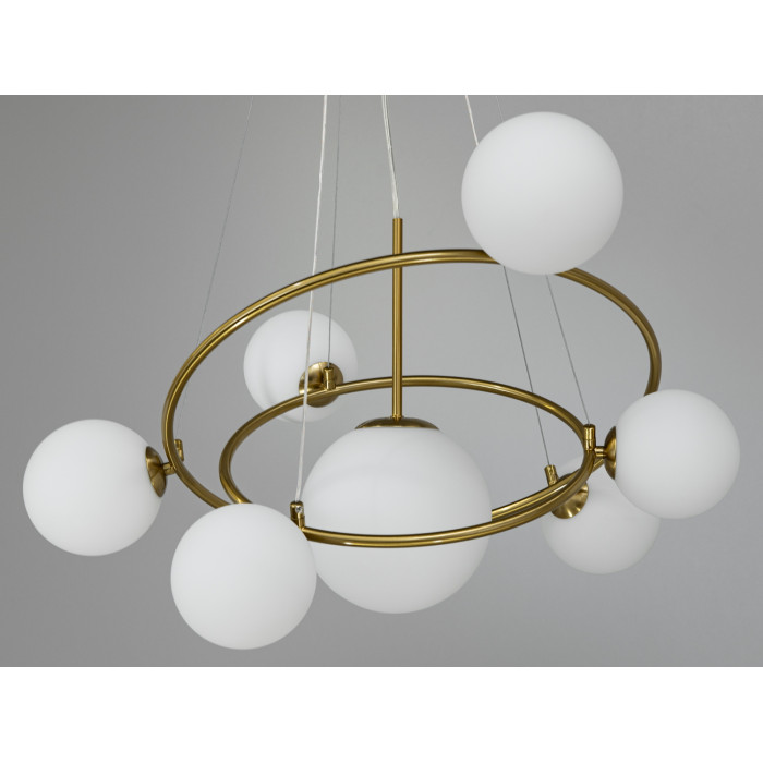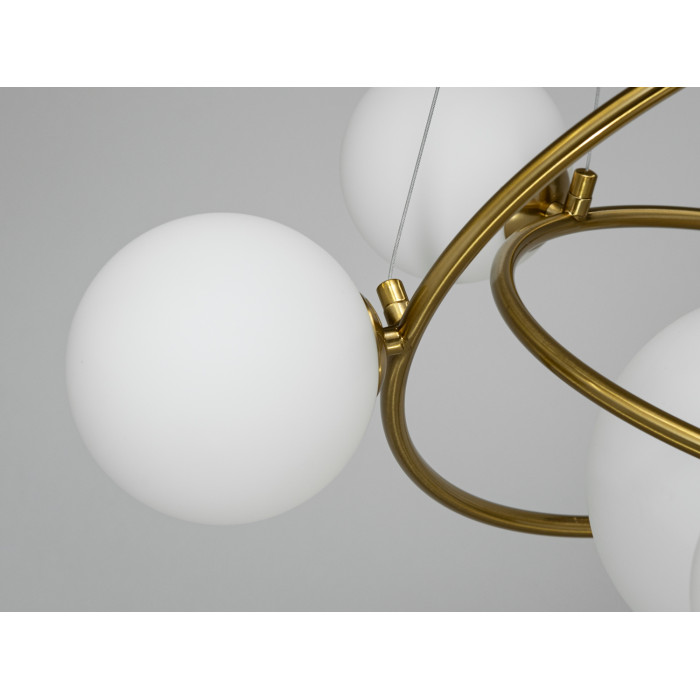 Одним із ключових елементів дизайну є скляні плафони білого матового кольору, що нагадують бульбашки. Ці плафони виконані у різних розмірах і кріпляться асиметрично, що надає люстрі унікальності та характеру. Різні розміри бульбашок створюють неповторний інтер'єрний акцент.