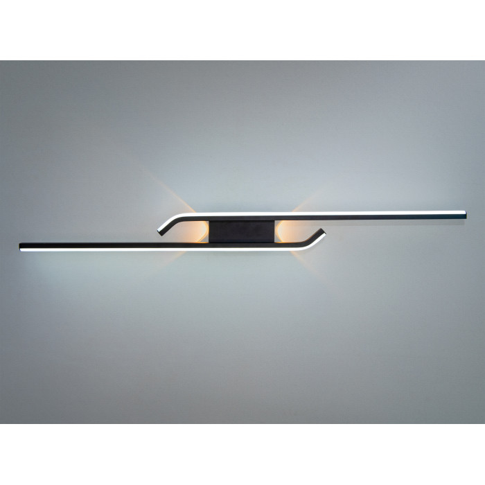 Цей стильний настінний світильник унікальний своїм сучасним мінімалістичним дизайном. Чорний матовий корпус з витонченими лініями плавно інтегрує дві горизонтальні LED смуги, які утворюють гармонійну композицію з легким вигином посередині. Його архітектурна форма виглядає як витвір сучасного мистецтва, який додає інтер'єру динаміки та завершеності. Ефект підсвічування стіни за рахунок центральної частини підкреслює глибину та стиль приміщення.