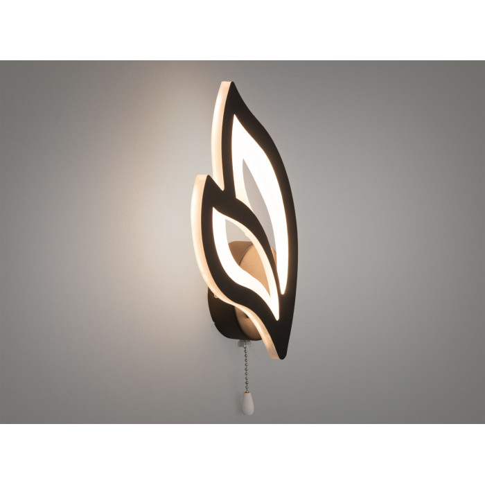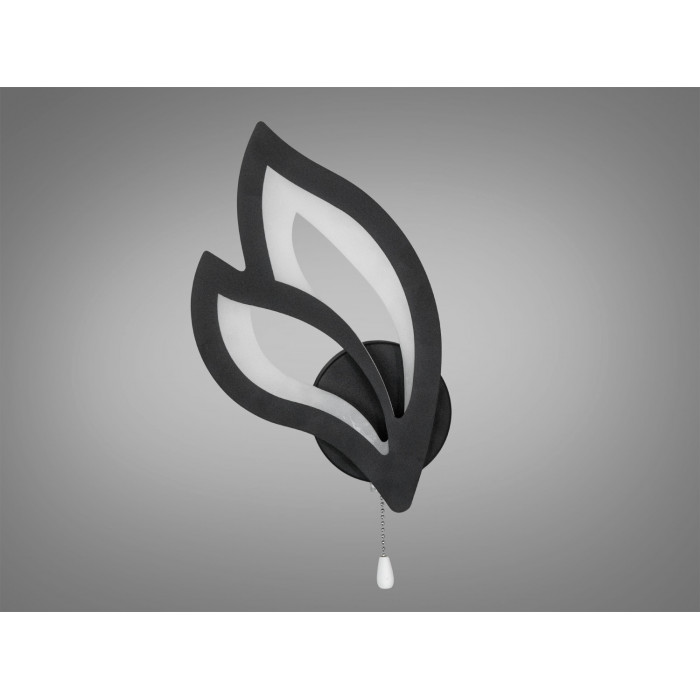 На фотографії зображено стильний і витончений світлодіодний настінний світильник, який відразу вражає своєю оригінальною, природною формою та глибоким чорним кольором. Його силует нагадує пару листків або пелюсток, що ніби розкриваються назустріч світлу. Такий дизайн не лише естетично привабливий, а й функціональний — криволінійні форми допомагають рівномірно розсіювати світло, формуючи навколо ніжну світлову ауру. Внутрішні краї пелюсток підсвічуються м’яким теплим LED-світлом, яке наче ллється зсередини, створюючи ефект глибини, об’єму та спокою. Чорний колір корпусу контрастує з білим світлом, підкреслюючи графічність і візуальну легкість виробу. Основа світильника округла, плавна, а невеличкий ланцюжок із краплевидною ручкою надає виробу нотки ретро-елегантності та виконує зручну керуючу функцію. Такий настінний LED світильник — це не просто освітлення, а витвір сучасного декоративного мистецтва, який чудово поєднується з різними інтер'єрними стилями.