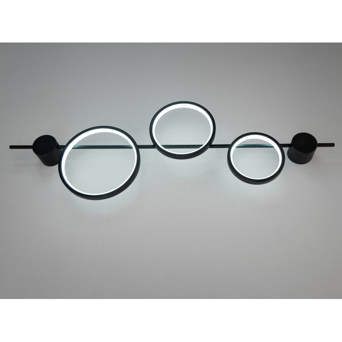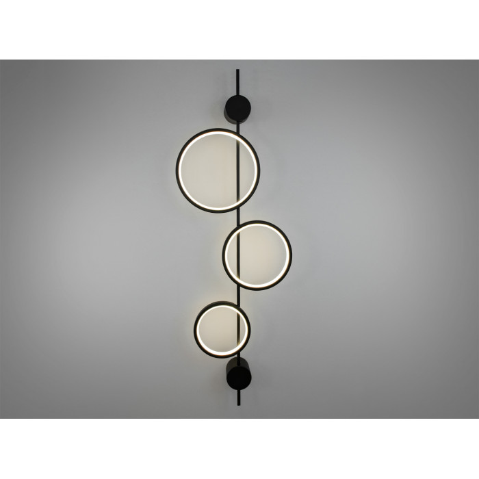 Цей настінний світильник бра — справжній шедевр сучасного дизайну, в якому гармонійно поєднано простоту форм, геометрію та стильні акценти. Його основа виконана у вигляді вертикальної чорної металевої лінії, від якої відходять три кола різного діаметра. Ці кола, оснащені LED підсвіткою, випромінюють м'яке світло, яке рівномірно розподіляється по простору. Матове чорне покриття корпусу додає світильнику витонченості та стриманої розкоші, роблячи його ідеальним вибором для сучасних інтер'єрів.