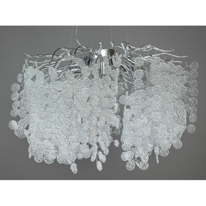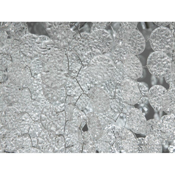 Основа люстри виготовлена з майстерно витих алюмінієвих гілок, кожна з яких увінчана вертикально розташованою гірляндою з матових та прозорих круглих огранених кришталів. Ці кришталики грайливо відбивають світло, створюючи чарівну гру відблисків та тіней у приміщенні.