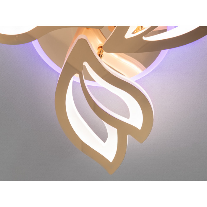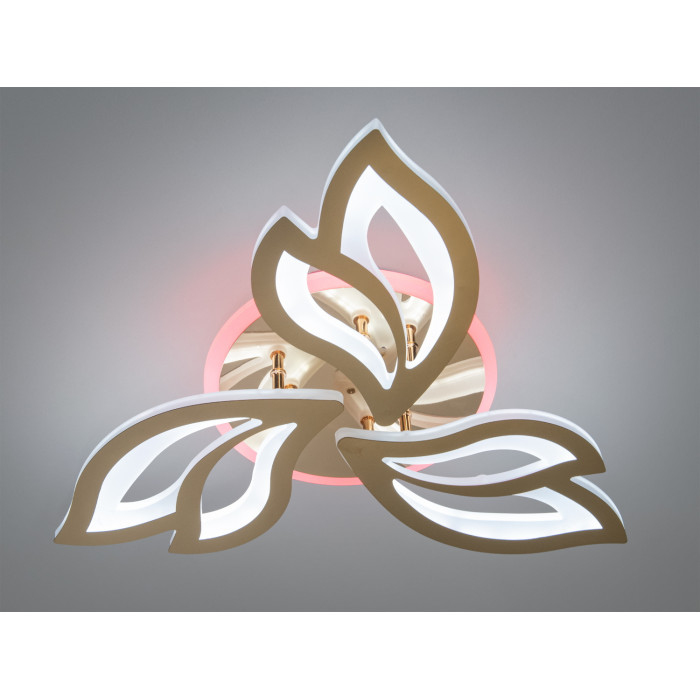 Ця світлодіодна люстра з пультом зачаровує своїм витонченим дизайном та сучасним функціоналом. Витончені акрилові елементи у формі листя створюють унікальну композицію, яка стане центральним акцентом у будь-якому інтер'єрі. Золотисті контури ефектно поєднуються з білими світлодіодними розсіювачами, надаючи виробу розкішного вигляду. Світлові модулі розміщені всередині акрилових розсіювачів, що забезпечує рівномірне освітлення без різких тіней. Пристрій кріпиться до стелі на металеву основу з LED підсвічуванням, яке додає додаткової виразності світильнику. Увімкнена LED люстра з пультом виглядає ніби сяюча квітка, що розкривається у просторі, наповнюючи кімнату м'яким та комфортним світлом. Гармонійне поєднання матеріалів та форми дозволяє цій люстрі органічно доповнити як сучасний, так і класичний інтер'єр. Світлодіодний світильник з пультом – це поєднання естетики, якості та передових технологій.