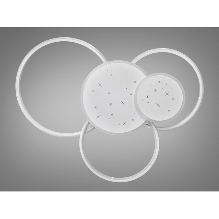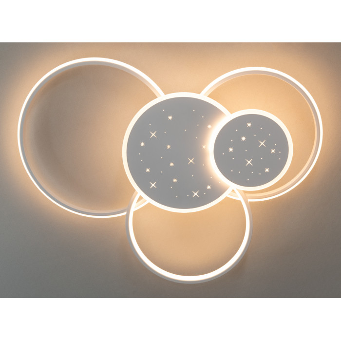 Стельова світлодіодна люстра у формі кілець – це ідеальне поєднання сучасного стилю, функціональності та елегантного дизайну. Її витончена конструкція складається з п’яти пересічних кілець, які створюють ефект легкості та простору. Основний акцент у дизайні зроблено на центральних світлодіодних панелях, декорованих візерунком «зоряного неба», що додає чарівності та унікальності освітленню. Білий колір корпусу гармонійно поєднується з акриловими розсіювачами, які забезпечують м’яке та рівномірне освітлення. Така люстра стане чудовим доповненням до будь-якого інтер’єру, надаючи приміщенню легкість та стильний вигляд.