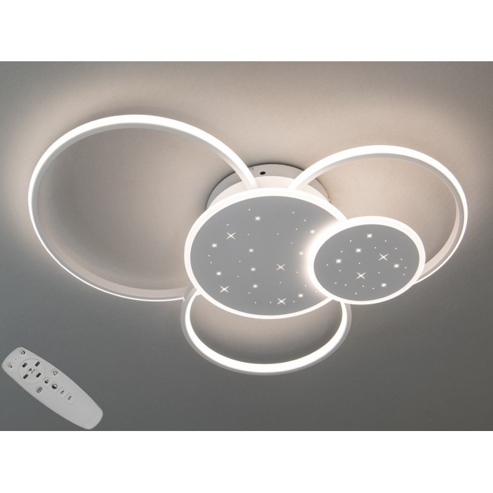 Люстра відноситься до категорії LED люстр на пульті, що забезпечує комфортне дистанційне керування без необхідності вставати з місця. Вона оснащена функцією нічного режиму, яка знижує яскравість до 5% від потужності, створюючи приємне м’яке світло, яке не заважає сну, але додає відчуття безпеки. Ця стельова світлодіодна люстра має вбудоване підсвічування, що створює м’який ореол світла навколо конструкції, надаючи приміщенню додаткового затишку.