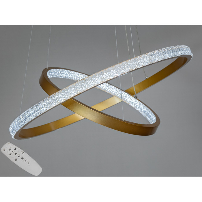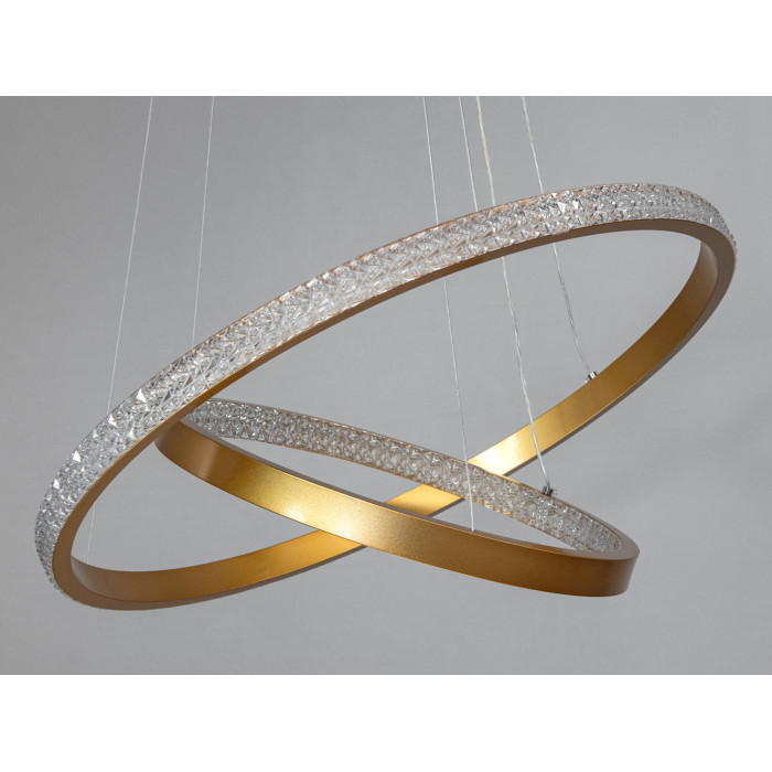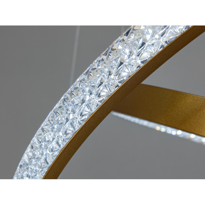 Розкіш, сучасний стиль і передові технології злилися в єдине ціле у цій підвісній світлодіодній люстрі. Витончена композиція лед люстри у формі двох перехрещених кілець створює ефект невагомості, ніби конструкція ширяє в просторі. Завдяки золотому металевому каркасу, поєднаному з кришталево прозорими акриловими розсіювачами, ця дизайнерська світлодіодна люстра на тросах виглядає вишукано та дорого. Відблиски світла, що розсіюються через грановану поверхню акрилу, створюють приголомшливу гру променів, наповнюючи кімнату чарівним сяйвом.