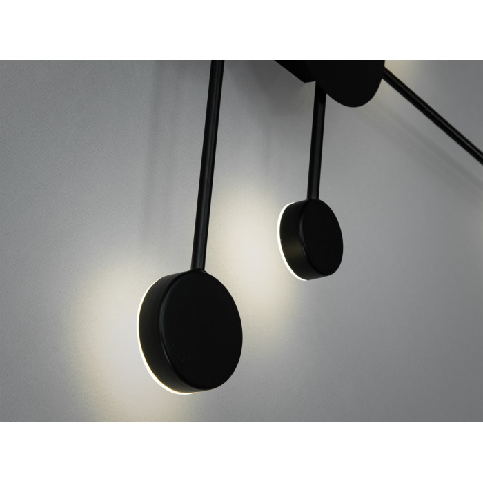 Каркас із чорного металу додає конструкції строгого і стильного вигляду, гармонійно вписуючись у інтер'єри, які віддають перевагу чітким лініям і контрастним рішенням. Чорний колір каркасу підкреслює геометричність світильника, роблячи його не лише джерелом світла, але й центральним декоративним елементом приміщення. Круглі плафони створюють ефект м’якого розсіяного світла, яке рівномірно заповнює простір, додаючи йому тепла та затишку.