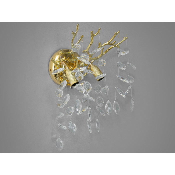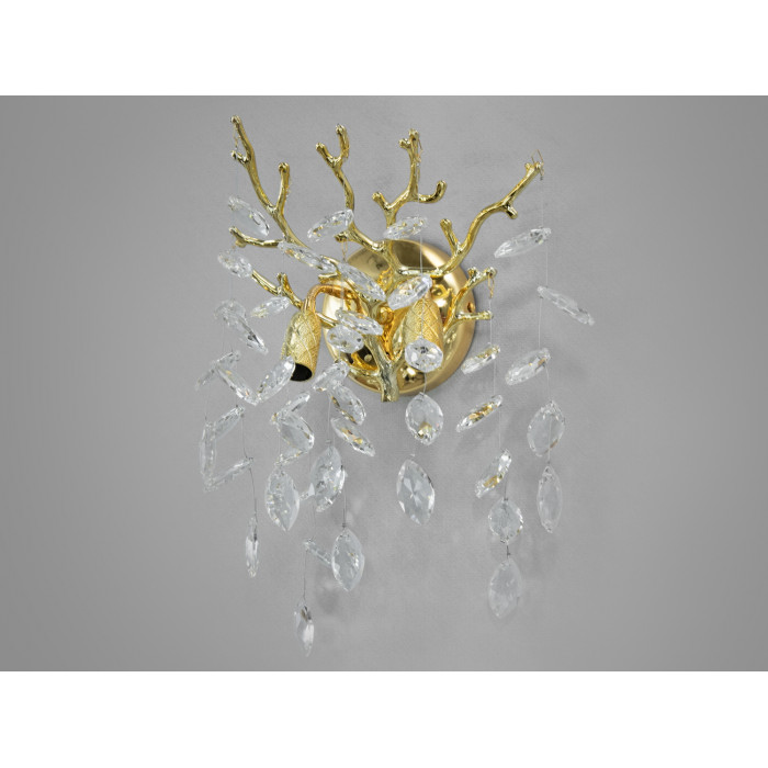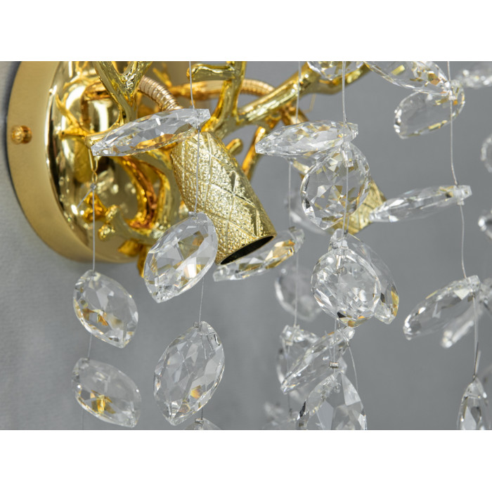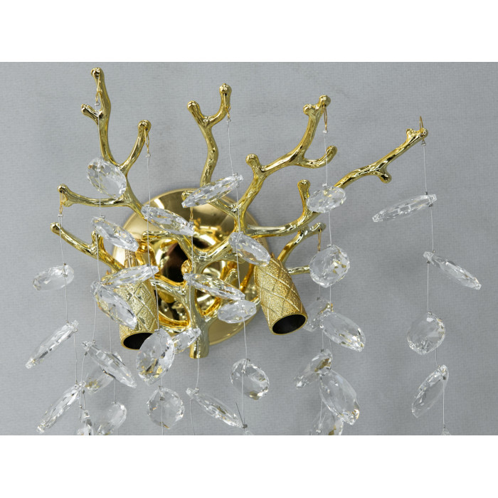 Основна частина світильника виконана у вигляді округлої золотистої пластини, від якої відходять декоративні елементи, що імітують гілки. Кожна гілка несе на собі низку кришталевих підвісок, що переливаються всіма барвами веселки при потраплянні на них світла. Завдяки такому дизайну, настінний декоративний світильник створює незабутнє відчуття розкоші та елегантності.