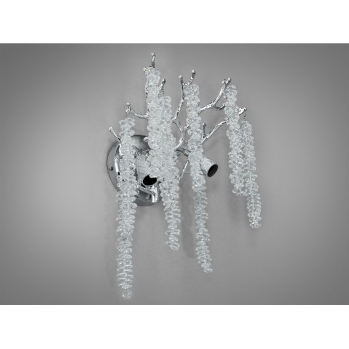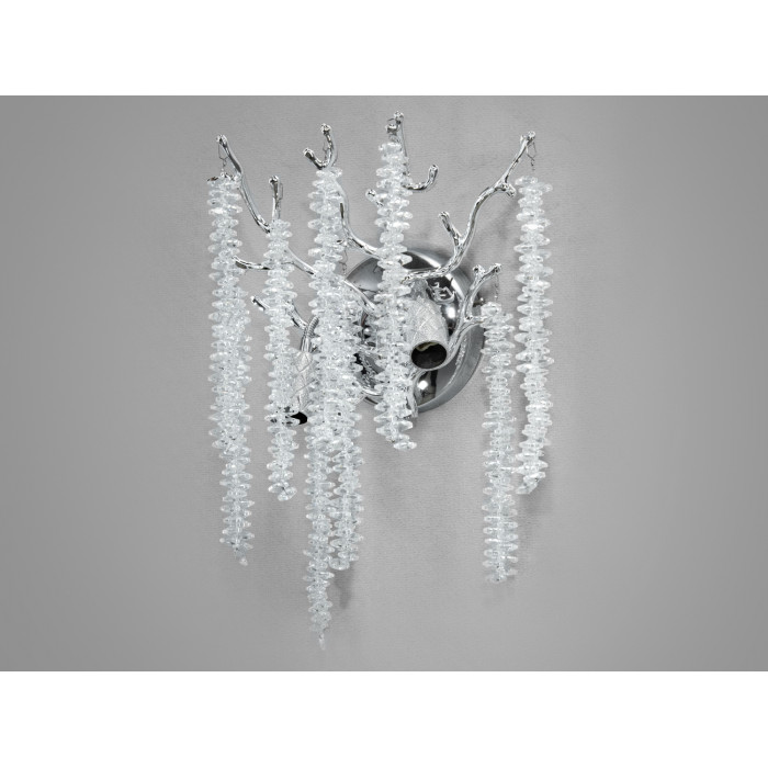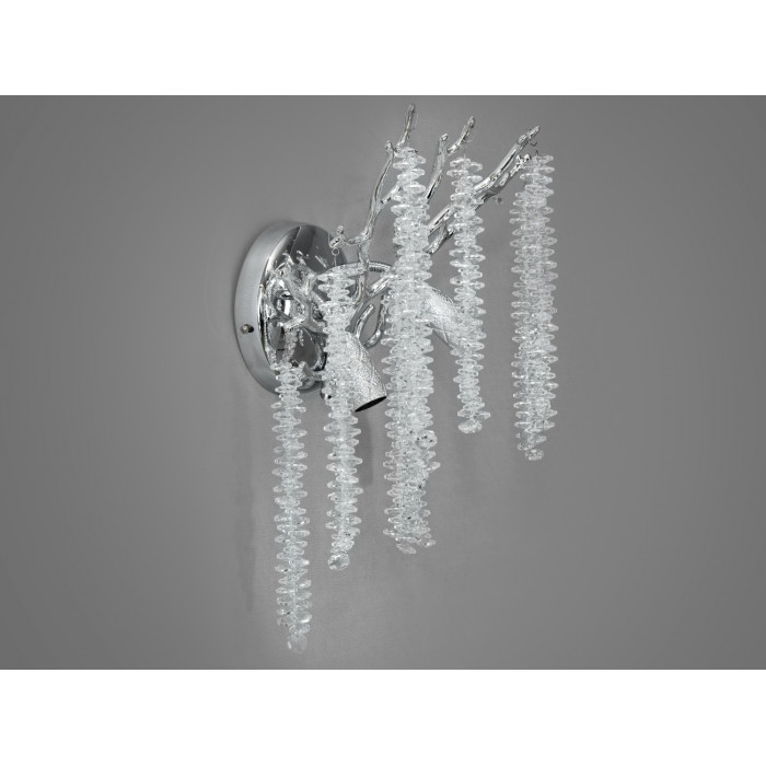 Світильник сателіт до кришталевих люстр "Гліцинія" від ТМ "Діаша" на 2 лампи, колір хром, вражає своїм витонченим і елегантним дизайном. Основу світильника становить округлий хромований диск, який створює відчуття сучасного блиску і розкоші. Від цієї основи відходять вигадливі гілкоподібні елементи, також покриті хромом, що надає світильнику додаткового шарму і неповторності. На цих декоративних гілках закріплені численні кришталеві підвіски різної форми і розміру, які звисають вниз у вигляді блискучих кришталевих сталактитів. Підвіски виготовлені з прозорого кришталю, що створює ефект переливів і сяйва при будь-якому освітленні. Світильник нагадує кришталевий водоспад, який випромінює світло, заломлюючись через кришталики.