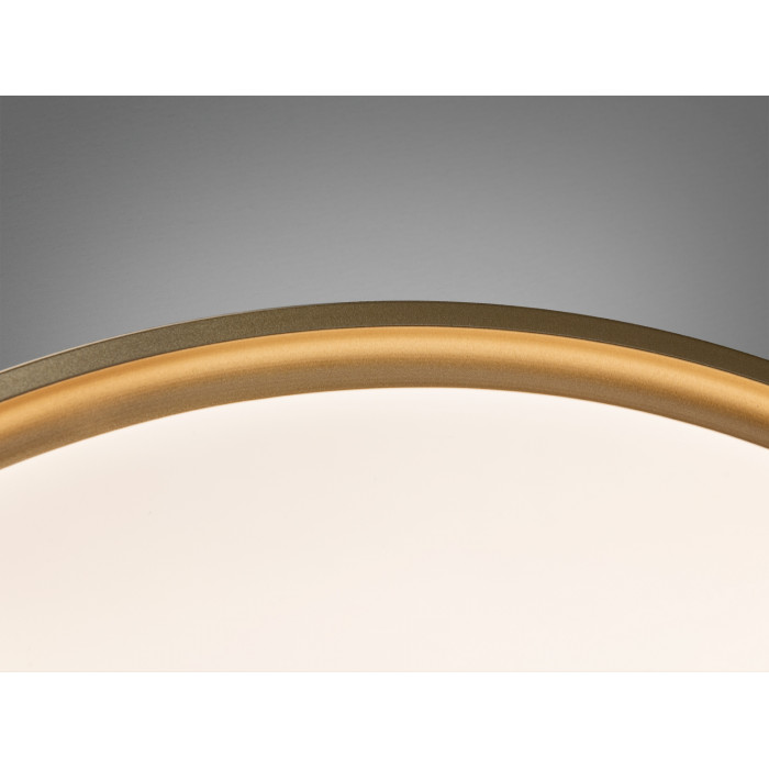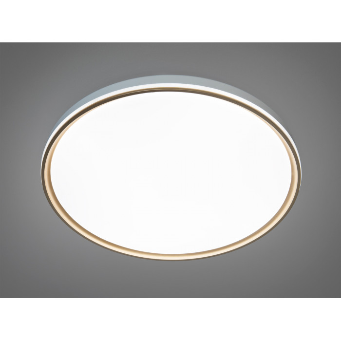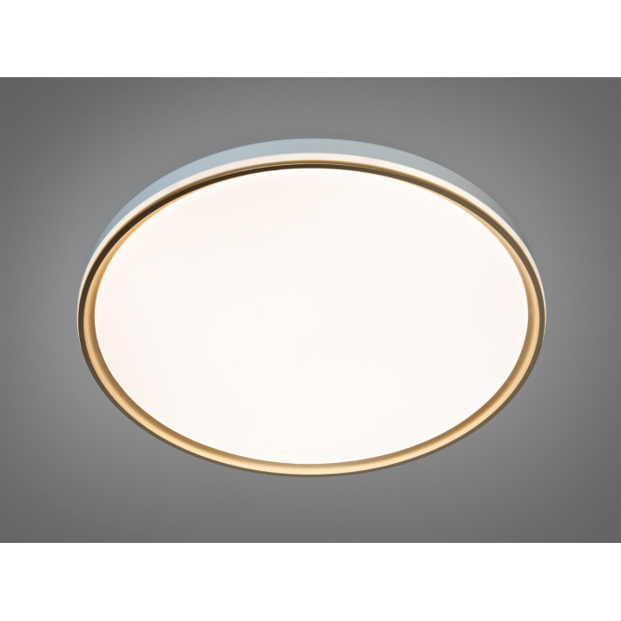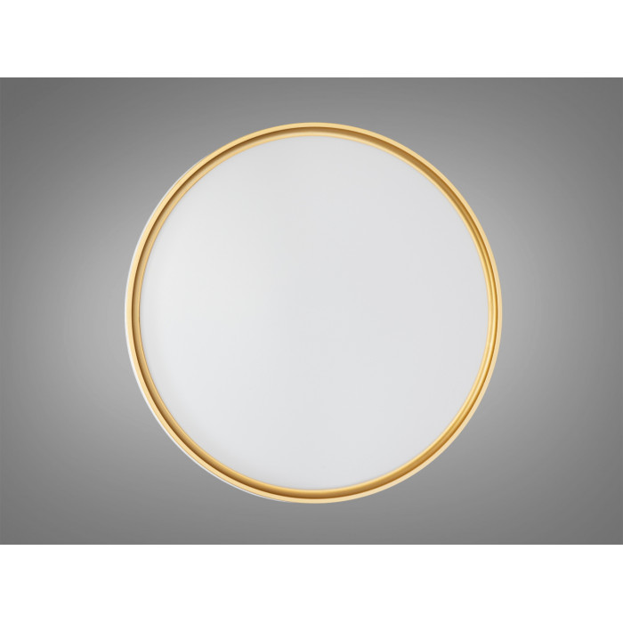 Золотиста рамка у поєднанні з білим плафоном надає світильнику елегантності. Гладка поверхня і матове покриття забезпечують м′яке, розсіяне світло, додаючи затишку в будь-якому приміщенні. Кругла форма дозволяє рівномірно розподіляти світло, роблячи його ідеальним для стельового монтажу.