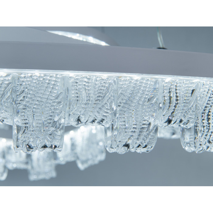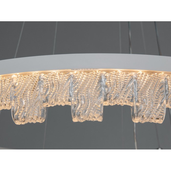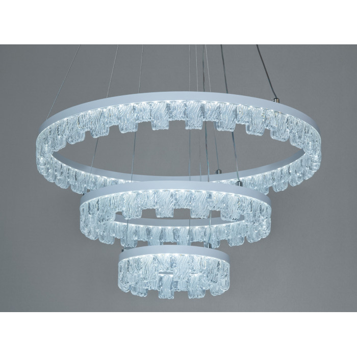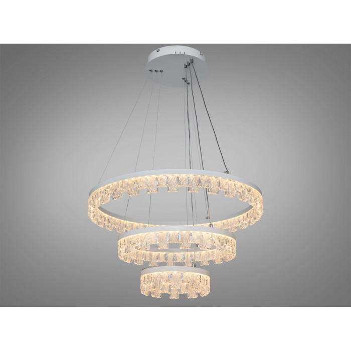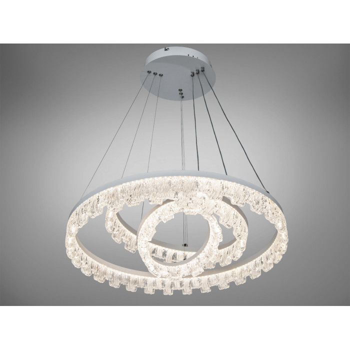 Світлодіодна підвісна люстра Diasha у білому кольорі з трьома круглими кільцями створює багаторівневе освітлення та виразний акцент у просторі. Прозорі елементи по периметру кілець формують кришталевий ефект без зайвої ваги та складного догляду. Загальна потужність 105 Вт зазвичай достатня для якісного загального світла у кімнатах площею до 18 м² (залежно від висоти стелі, кольору стін і планування). Модель постачається без пульта і керується стандартним настінним вимикачем.