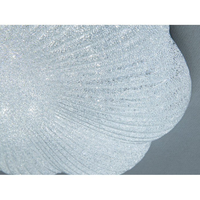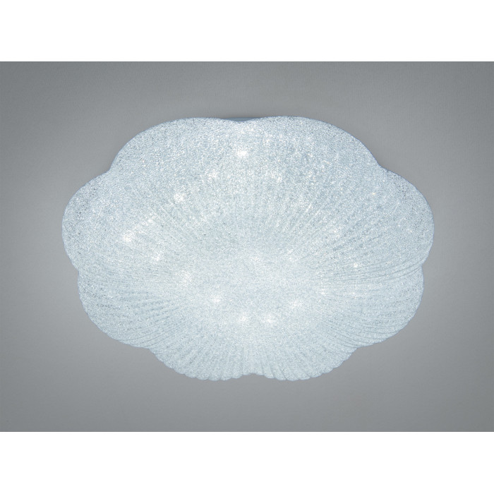 Світильник має лаконічний круглий корпус із білим обідком і скляним розсіювачем. Скло може виглядати гладким або з делікатною текстурою, що підкреслює форму та допомагає пом’якшити світловий потік. Завдяки нейтральному кольору та акуратним пропорціям люстра органічно поєднується зі світлими стелями, не перевантажує інтер’єр і візуально додає простору.