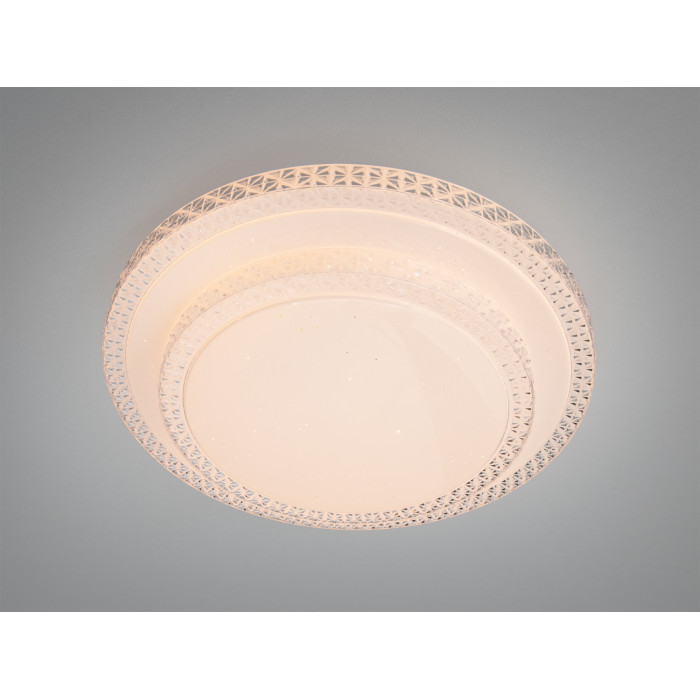Кругла стельова люстра-панель Diasha у білому кольорі створює рівномірне м’яке освітлення та економно споживає електроенергію завдяки вбудованим світлодіодам. Потужність 34 Вт зазвичай достатня для невеликих приміщень площею до 6 м². Модель монтується накладним способом, керується звичайним настінним вимикачем і постачається без пульта, що спрощує використання та знижує вартість володіння.