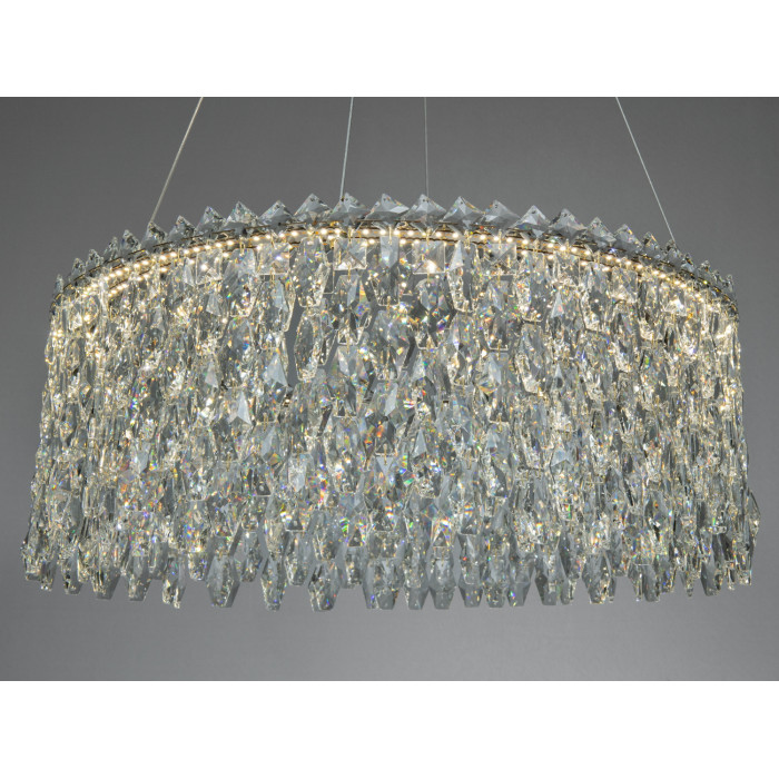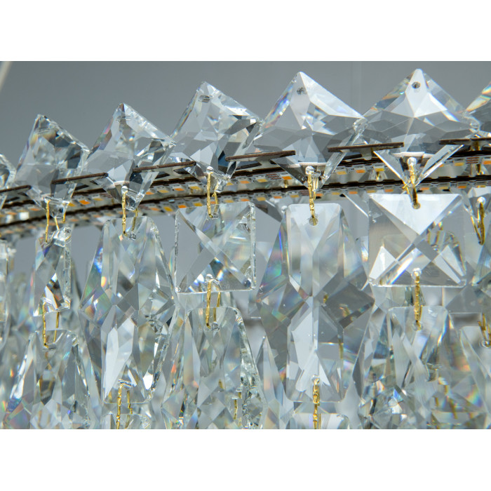 Конструкція складається з трьох круглих LED-кілець, підвішених на тонких регульованих тросах до стельової основи. Золоте покриття металевого каркаса підкреслює гранювання прозорих підвісів і формує виразні відблиски без зайвого засліплення. Кришталеві елементи розсіюють світло, створюючи багатошарову гру блиску, доречну у сучасних інтер’єрах.
