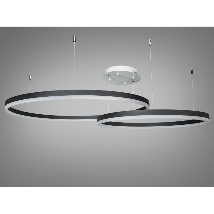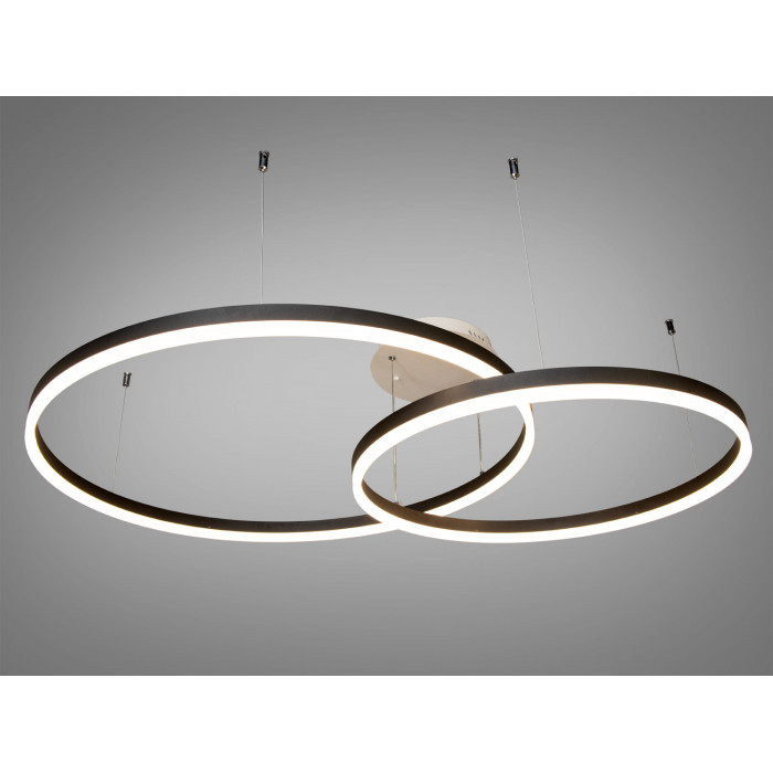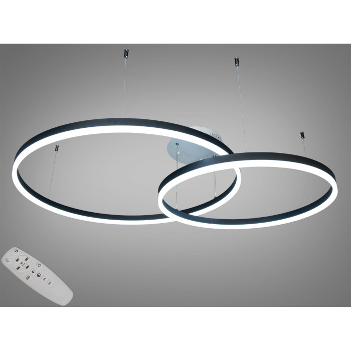 Стильна, сучасна та елегантна – саме так можна описати цю підвісну світлодіодну люстру з пультом. Чорний металевий каркас надає їй виразності та контрасту, а тонкі троси створюють ефект ширяння у просторі. Два LED кільця гармонійно переплітаються, формуючи витончену геометрію, яка стає центральним елементом інтер’єру. Акрилові розсіювачі рівномірно розподіляють світло, роблячи його м’яким та комфортним для очей. Завдяки можливості регулювання кольорової температури ви зможете налаштовувати освітлення відповідно до свого настрою.