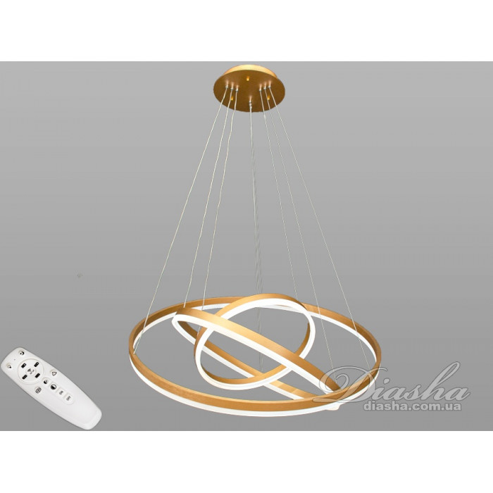 Сучасна світлодіодна люстра на підвісах з додатковим підсвічуванням, є справжнім втіленням сучасності та витонченості в дизайні освітлювальних приладів. Три незалежні кільця різних розмірів виконані в золотому кольорі та мають елегантний металевий блиск, що додає люстрі легкості та повітряності. Кожне кільце здається плаваючим у повітрі, створюючи ілюзію невагомості.