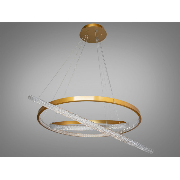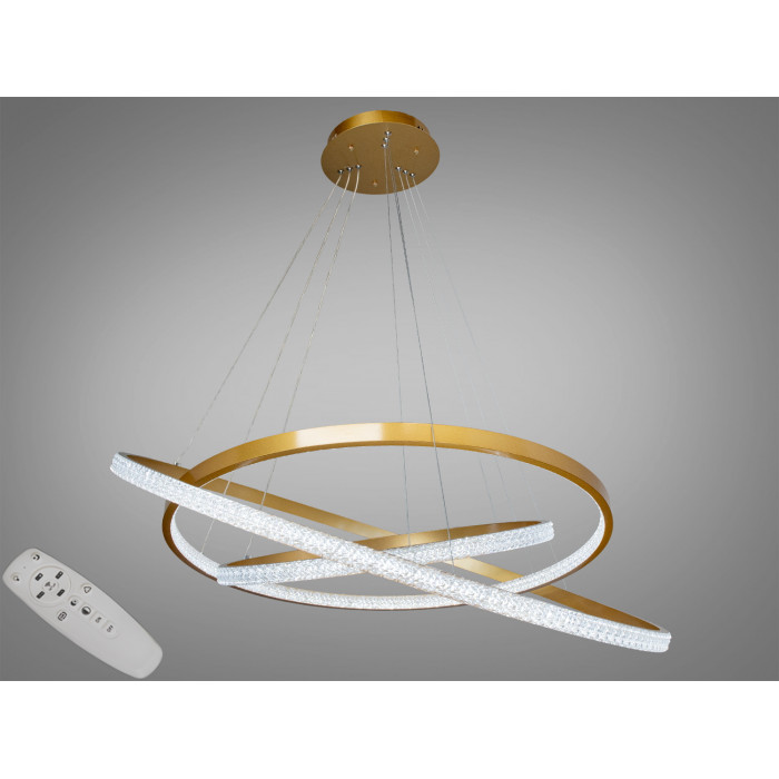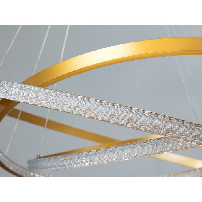 Сучасна світлодіодна люстра на підвісах, є справжнім втіленням сучасності та витонченості в дизайні освітлювальних приладів. Три незалежні кільця різних розмірів виконані в золотому кольорі, мають елегантний металевий блиск та наявність розсіювачів зі стильного рифленного акрилу схожого на кришталь, що додає люстрі легкості та повітряності. Кожне кільце здається плаваючим у повітрі, створюючи ілюзію невагомості.