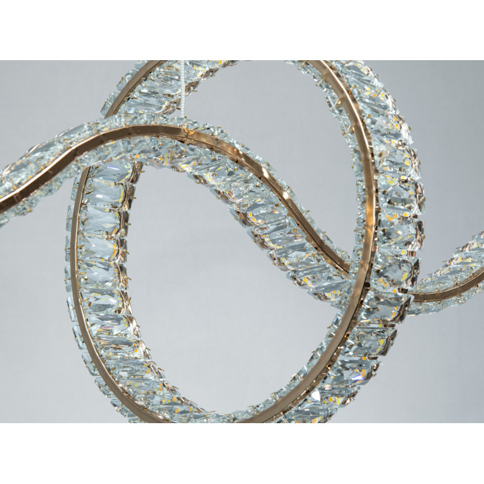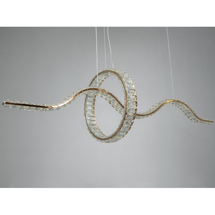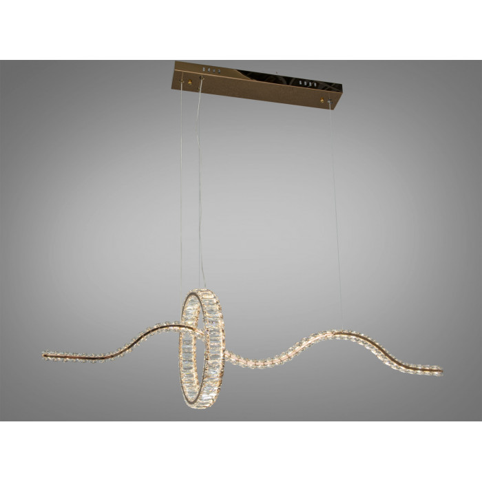 Кришталева світлодіодна підвісна люстра витягнутої форми з кільцем та хвилястою лінією створює виразну геометрію світла. Поєднання золотого оздоблення, прозорого кришталю та інтегрованих світлодіодів формує мʼяке сяйво без засліплення. Завдяки потужності 55 Вт модель розрахована на ефективне освітлення кімнат до 10 м², а пульт дистанційного керування додає зручності щоденного використання. Це рішення відповідає категоріям світлодіодні люстри та підвіси LED і може вдало доповнити сучасні інтерʼєри, де важливі чисті лінії та кероване освітлення.
